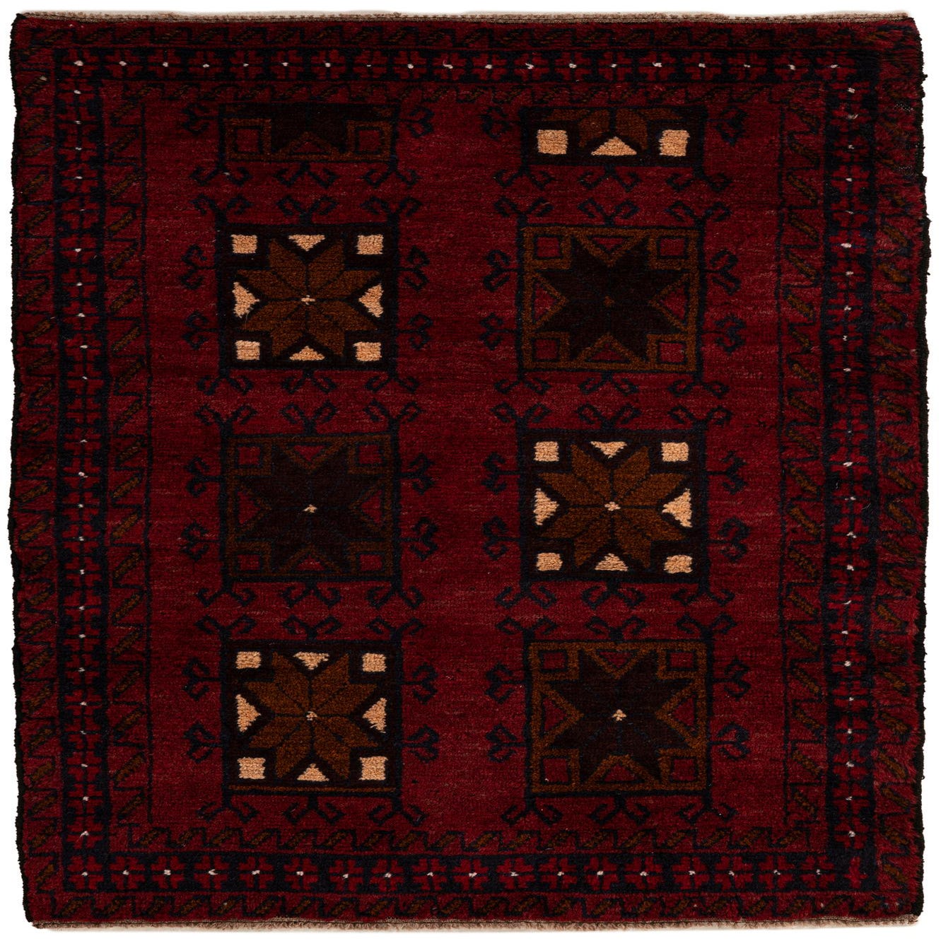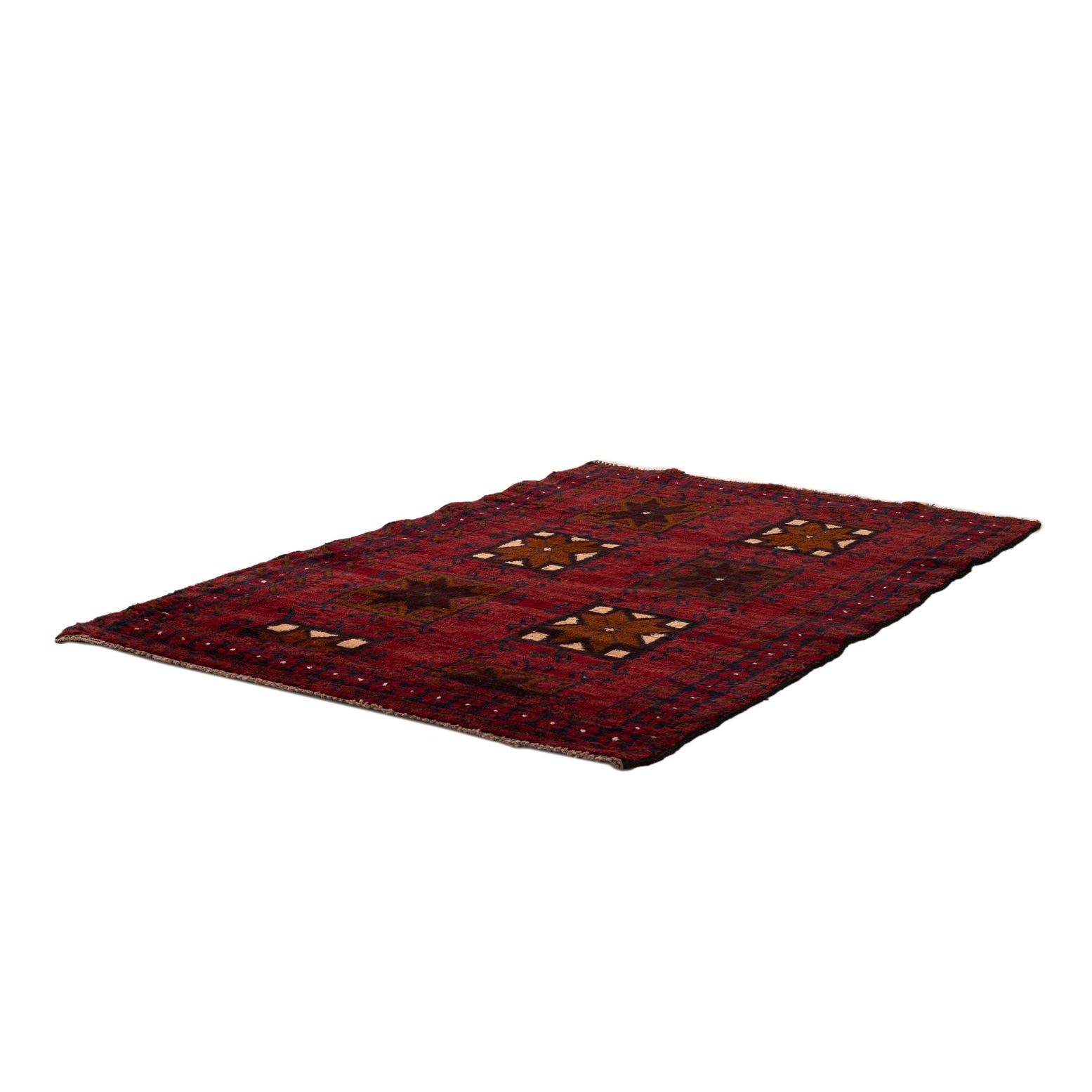 A 3x5 rectangular Balouch rug in deep red with traditional tribal patterns and dark brown and tan medallions.
