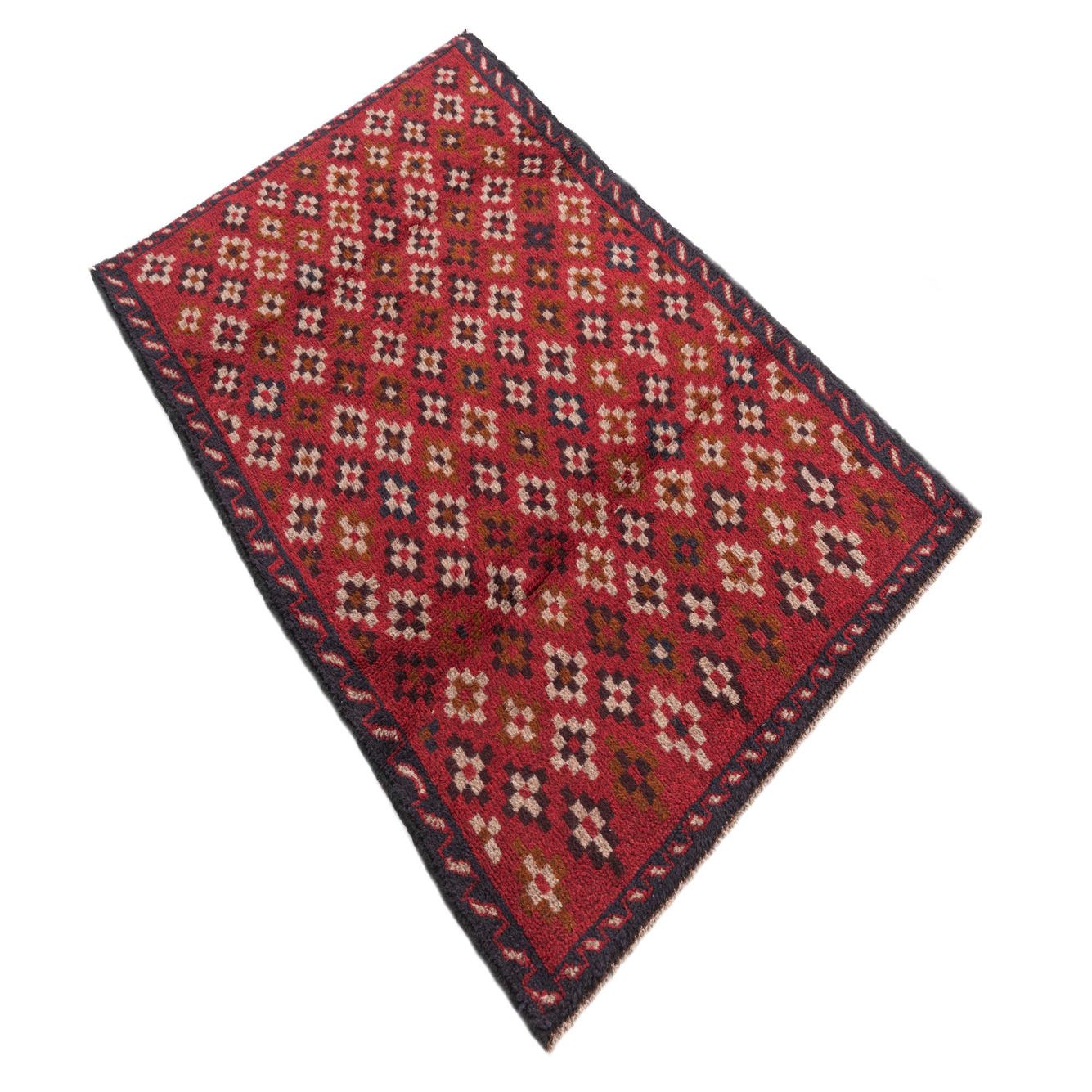This Balouch collection rug is a hand-knotted 3x5 piece, crafted with 100% wool, offering a textured feel underfoot. The rug showcases a burgundy background enlivened by a pattern of repeated geometric motifs in a harmonious palette that includes maroon, navy blue, terracotta, and light brown. The design carries a traditional aesthetic with symmetrical arrangements that convey a sense of order and heritage.