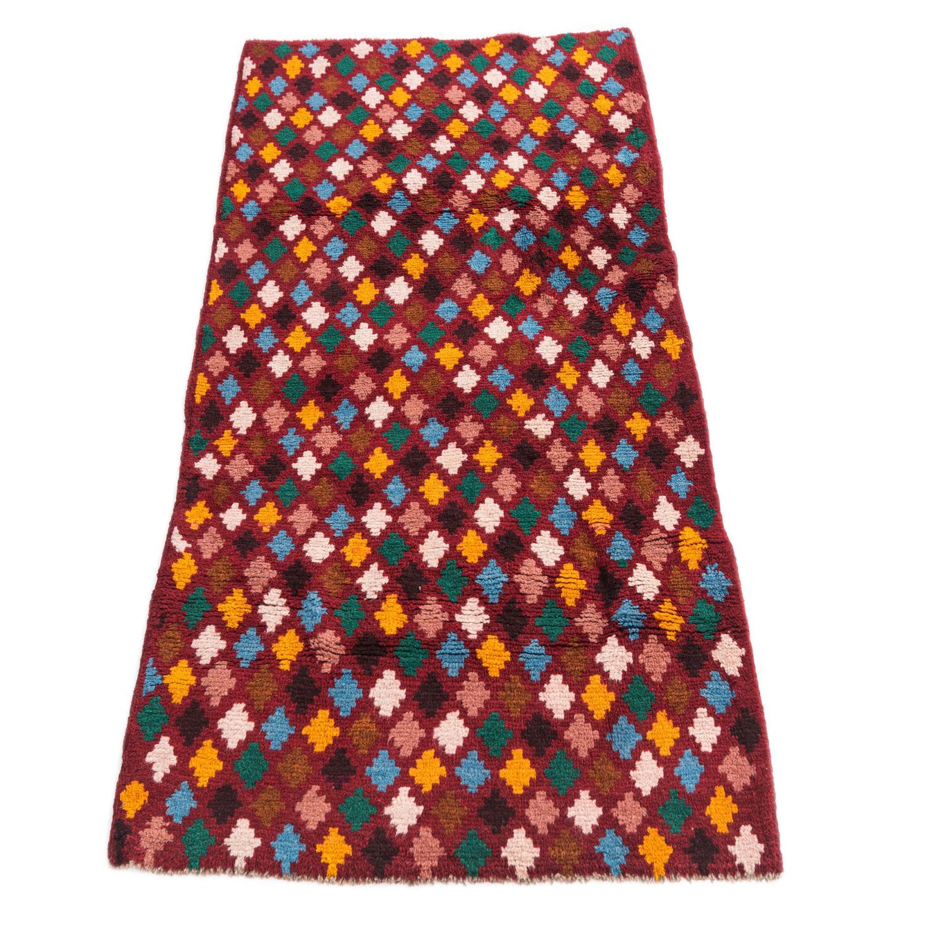 A 3x5 rectangular Balouch rug with a deep red background and a colorful tribal diamond pattern in blue, gold, green, and cream.