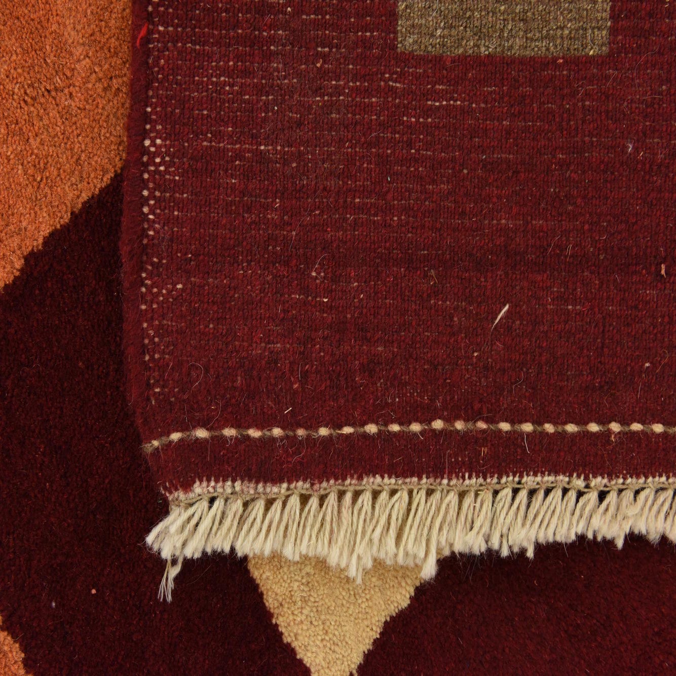 Primary color is Burgundy. Colors in this rug include: Burgundy, Brown, Orange, Ivory.