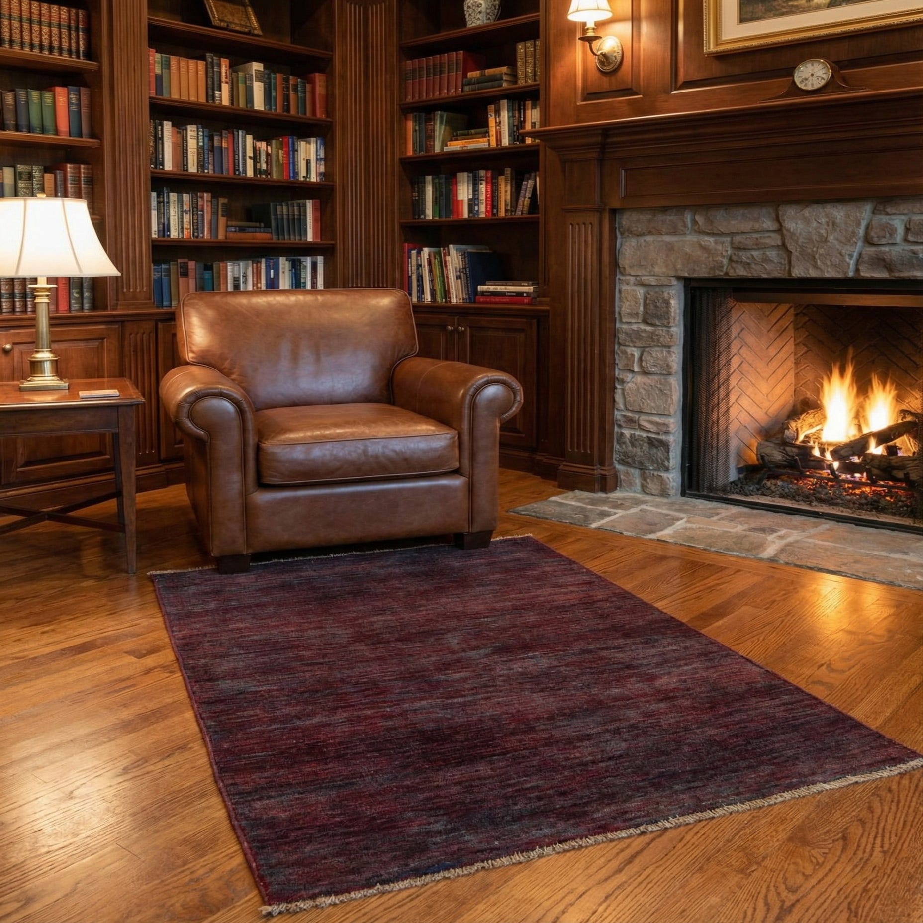 This rug is particularly suitable for interiors seeking a rich, warm anchor piece, and would complement spaces with wood finishes or leather furnishings beautifully. Its timeless color scheme and traditional handcrafted construction make it an ideal match for classic and contemporary decors alike, perhaps as a contrast against light hardwood floors or as a harmonious element in moody, dark-toned rooms.