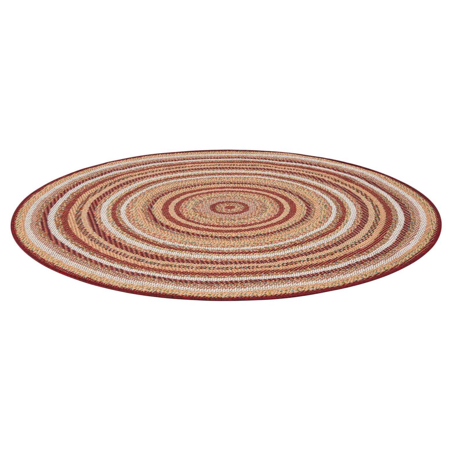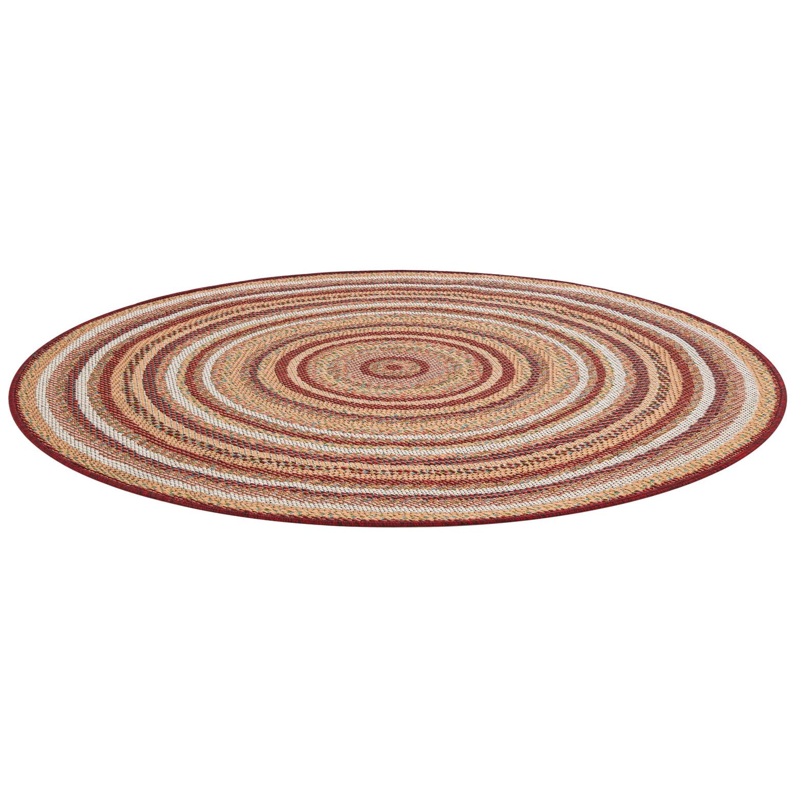 A round rug built on a rich burgundy background, this piece layers concentric braided bands in ivory, blue, green and orange for a warm, woven look. The pattern alternates tight stitches and slightly raised rows, creating subtle visual movement and a tactile, low-profile surface you can feel underfoot. Machine made of 100% polypropylene, it offers a resilient, tightly woven texture that holds its shape and maintains the woven detail.