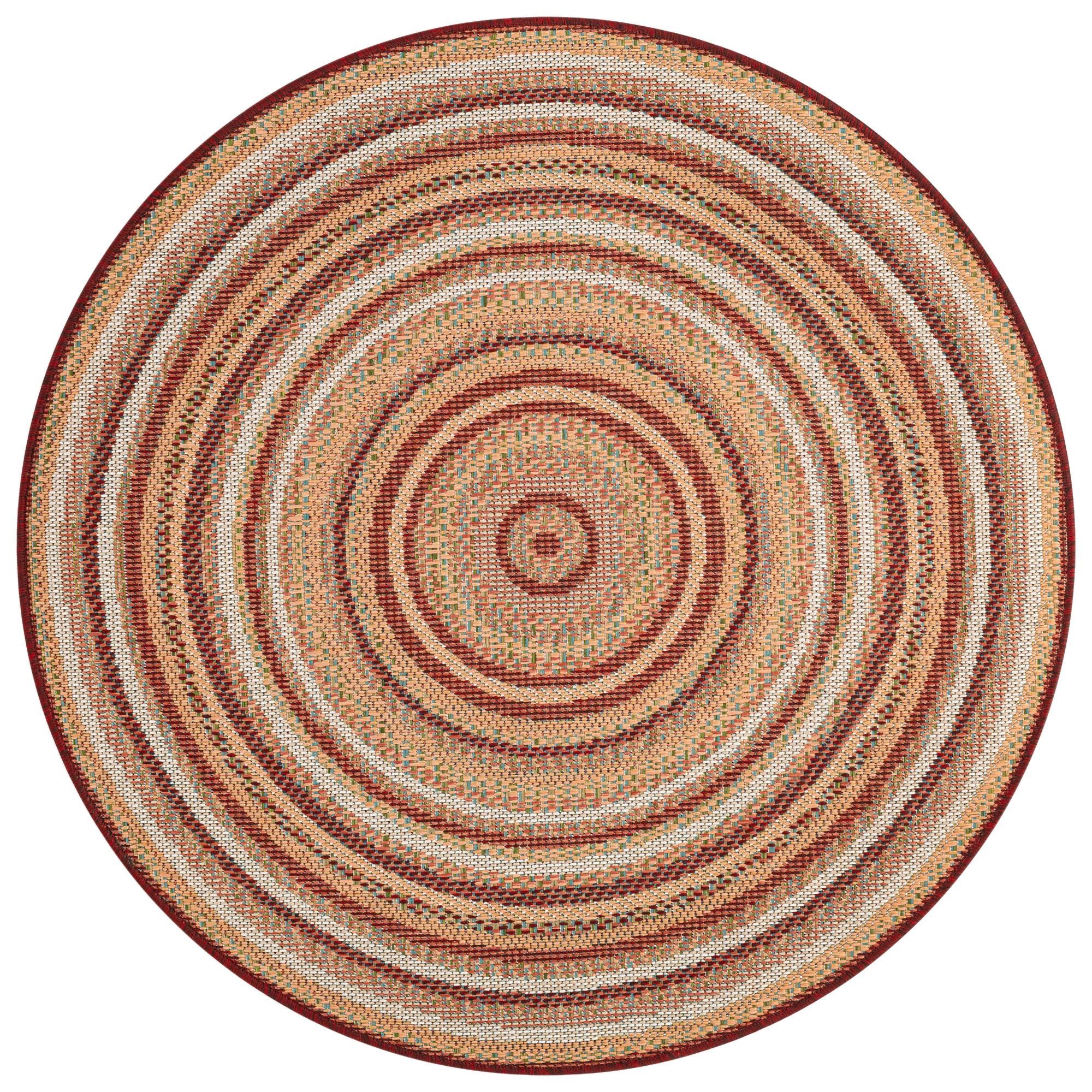 A round rug built on a rich burgundy background, this piece layers concentric braided bands in ivory, blue, green and orange for a warm, woven look. The pattern alternates tight stitches and slightly raised rows, creating subtle visual movement and a tactile, low-profile surface you can feel underfoot. Machine made of 100% polypropylene, it offers a resilient, tightly woven texture that holds its shape and maintains the woven detail.