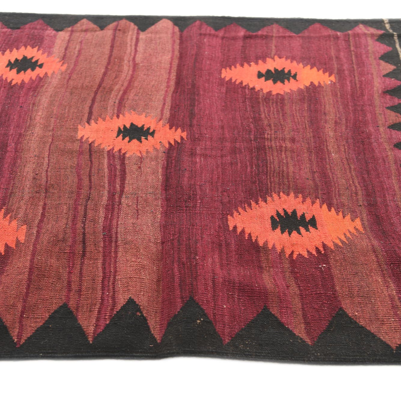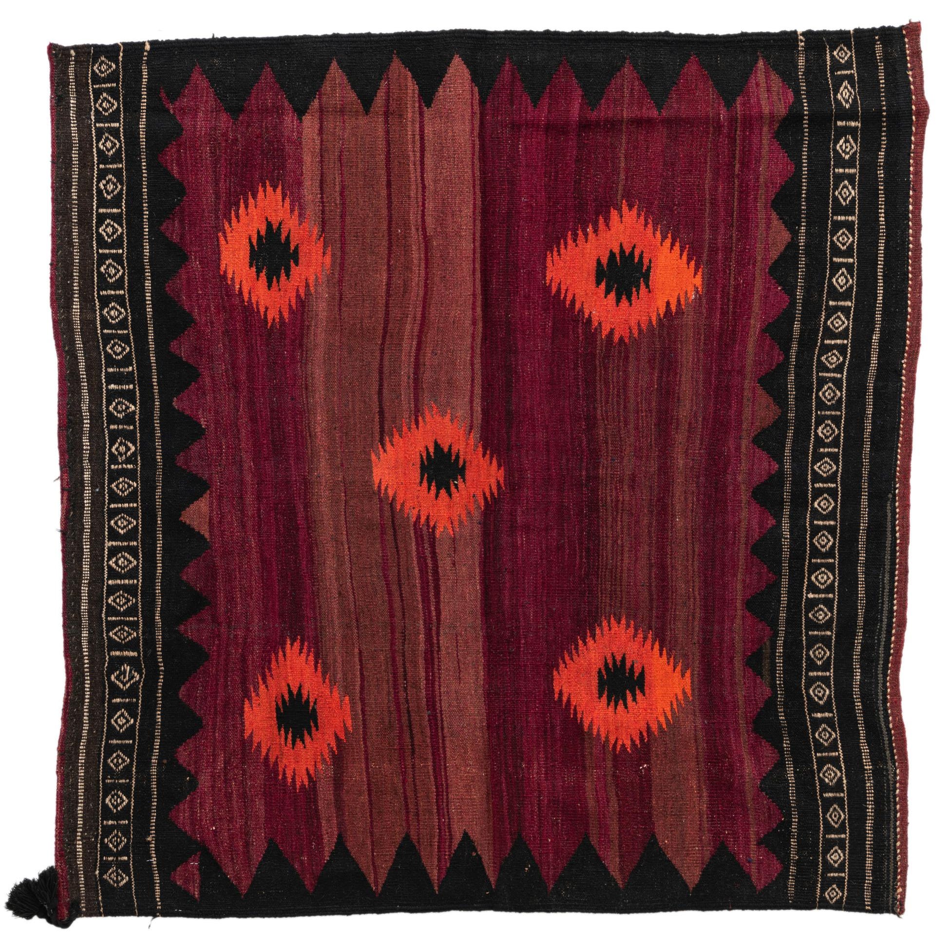 A 4' 4 x 4' 7 square Kilim Afghan rug featuring a red and maroon striped field with five orange and black tribal eye motifs, bordered by black triangles and a black and beige geometric pattern.
