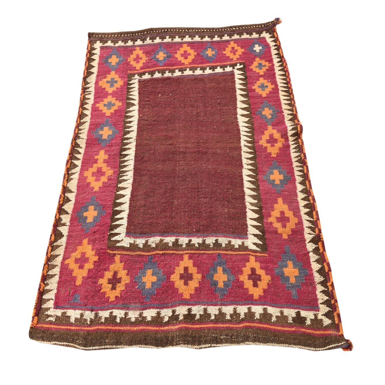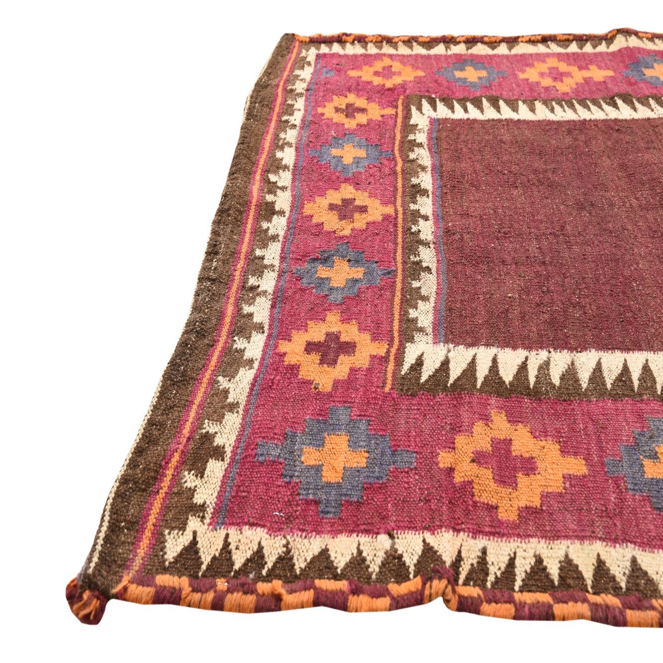 A 3' 8 x 4' 7 square Kilim Fars rug featuring a deep red center and a vibrant fuchsia border with orange and blue tribal patterns.