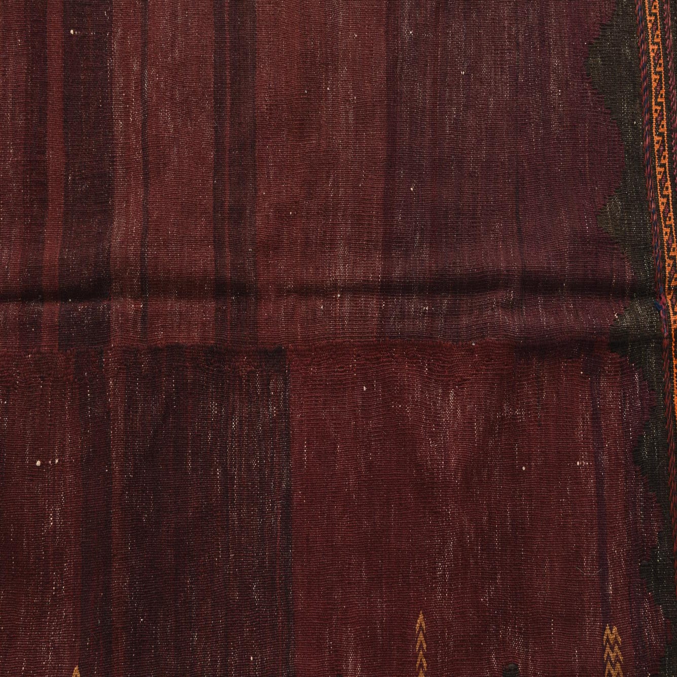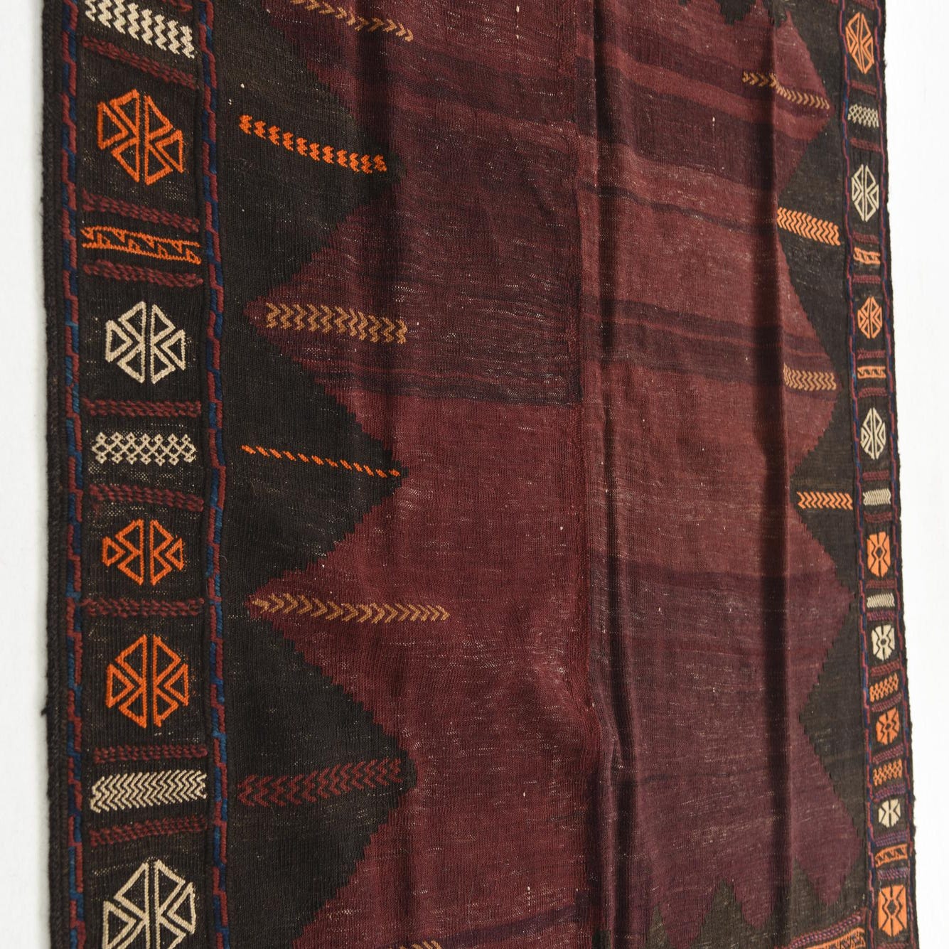 A 4' 2 x 4' 6 square Kilim Fars rug featuring a deep red field with black tribal patterns and a multi-color geometric border.