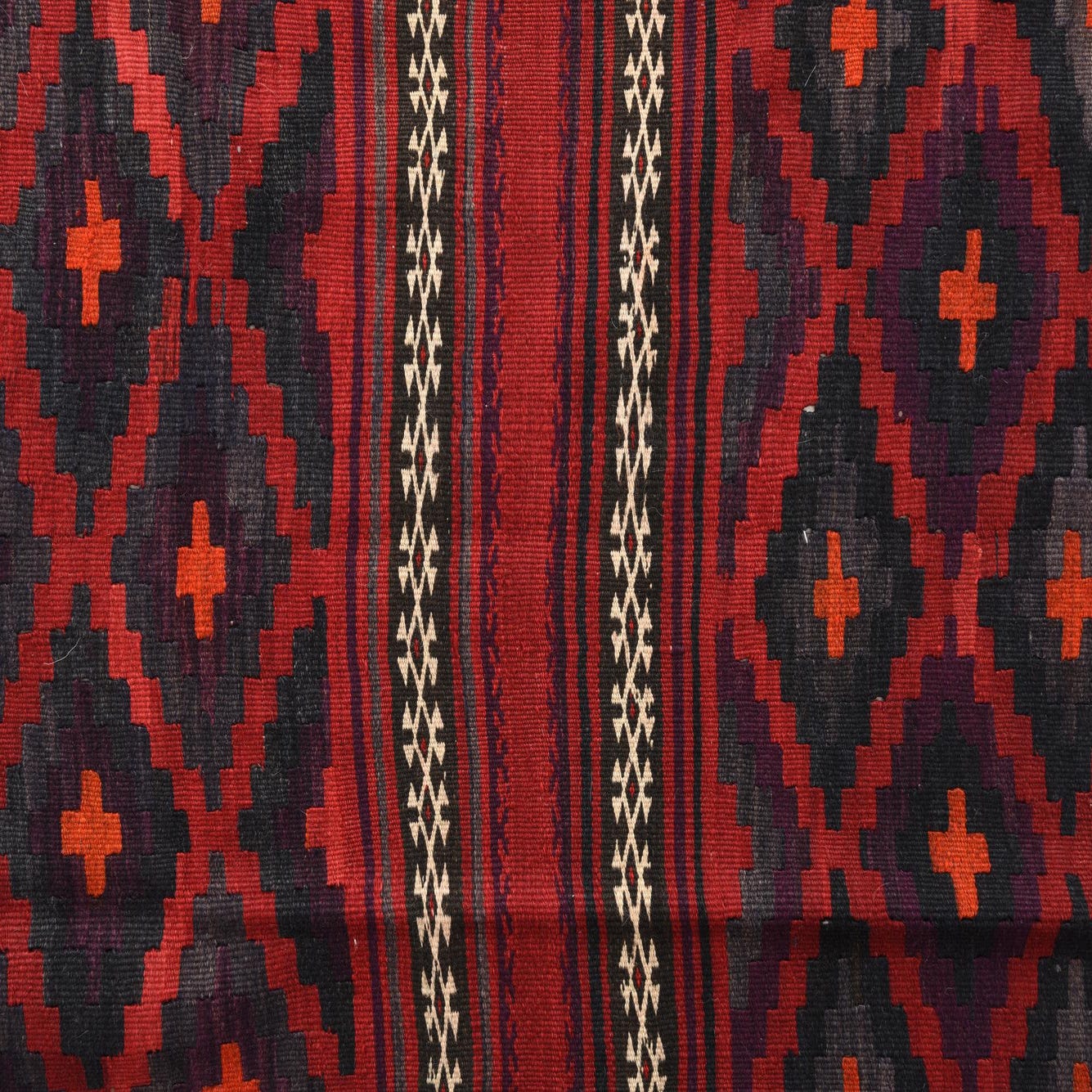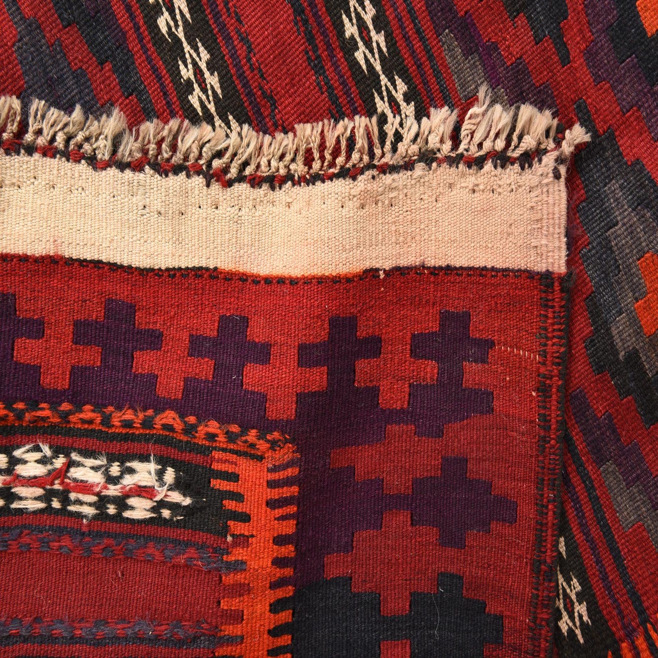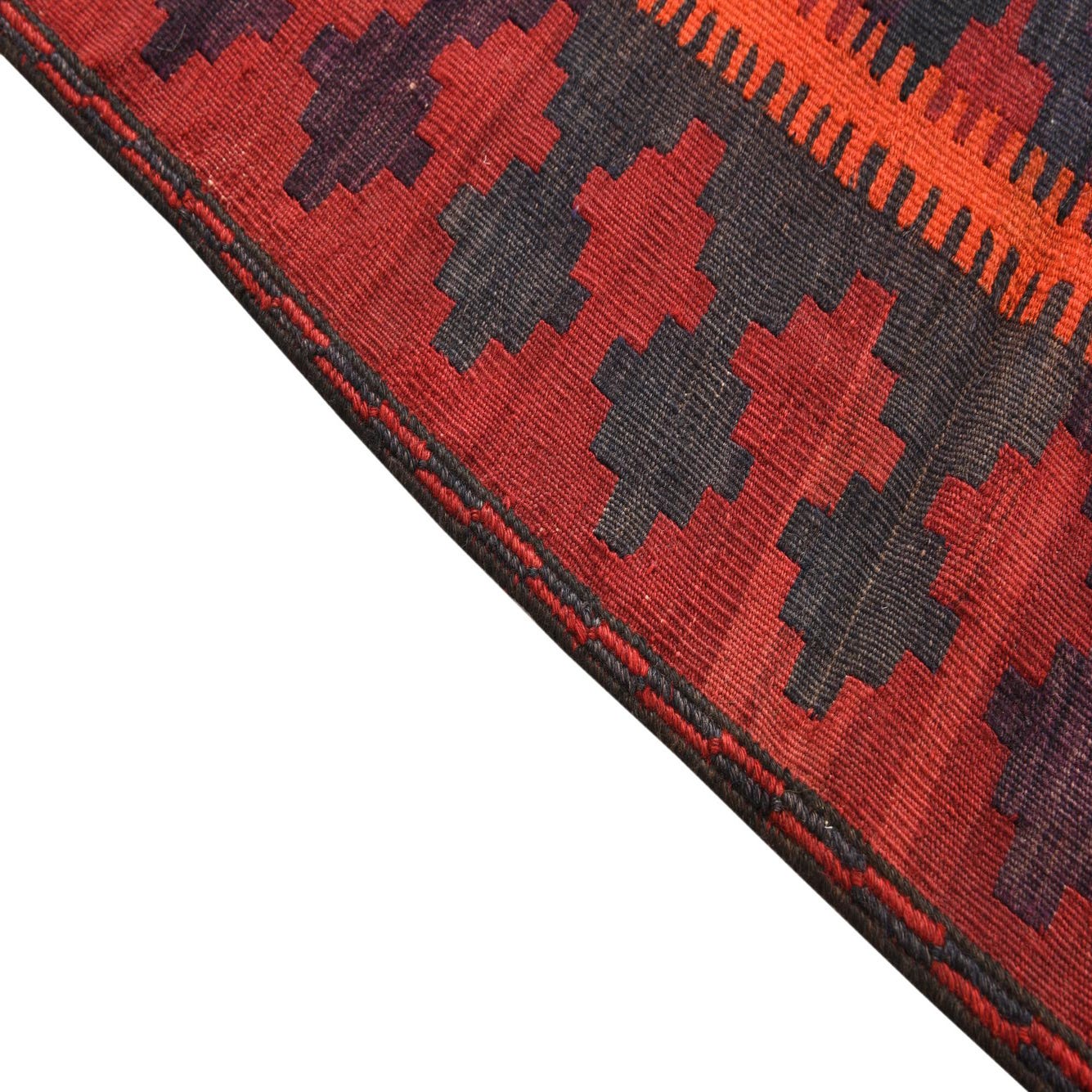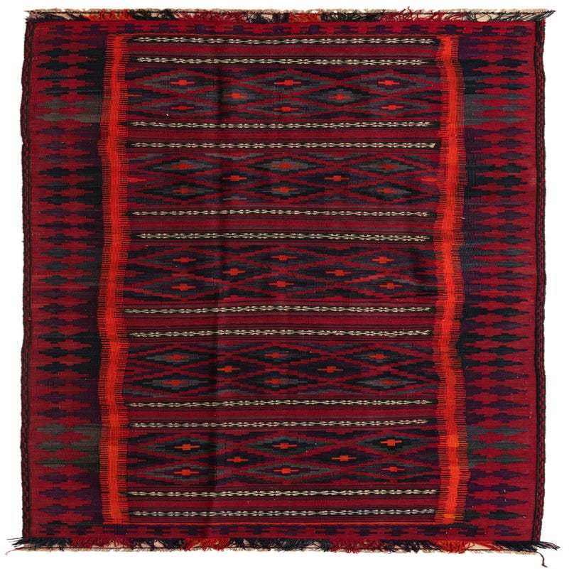 The Kilim Fars collection presents a hand-woven 100% wool runner, notable for its durable craftsmanship and timeless design. Spanning 4x11 feet, this semi-antique piece is approximately 40-60 years old, adding a touch of historical depth to its aesthetic appeal. The rug features a dominant burgundy background, complemented by a palette of black, ivory, olive, purple, and gray. The interplay of these colors creates a visually striking geometric pattern that is characteristic of traditional Kilim designs.