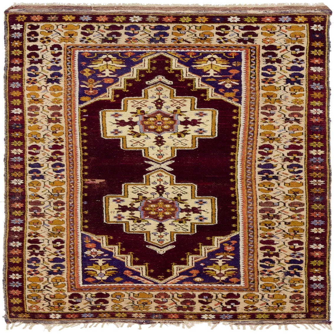 Primary color is Burgundy. Colors in this rug include: Burgundy, Beige, Blue, Gold, Ivory, Purple, Pink, Orange.