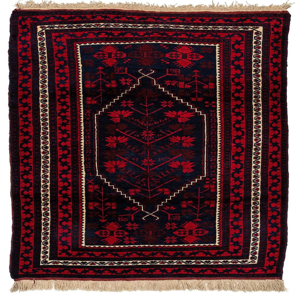 A 4x6 rectangular Balouch rug with a deep red and navy tribal pattern, featuring a central medallion and intricate borders, suitable for an entryway or living room.