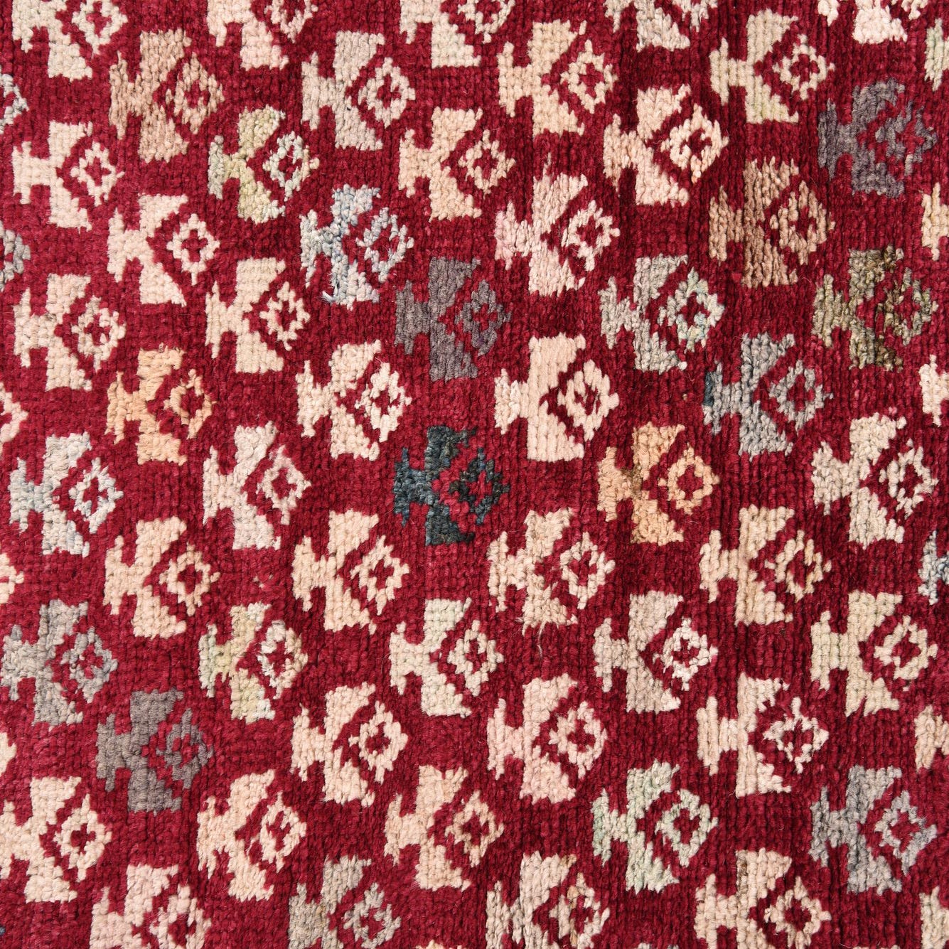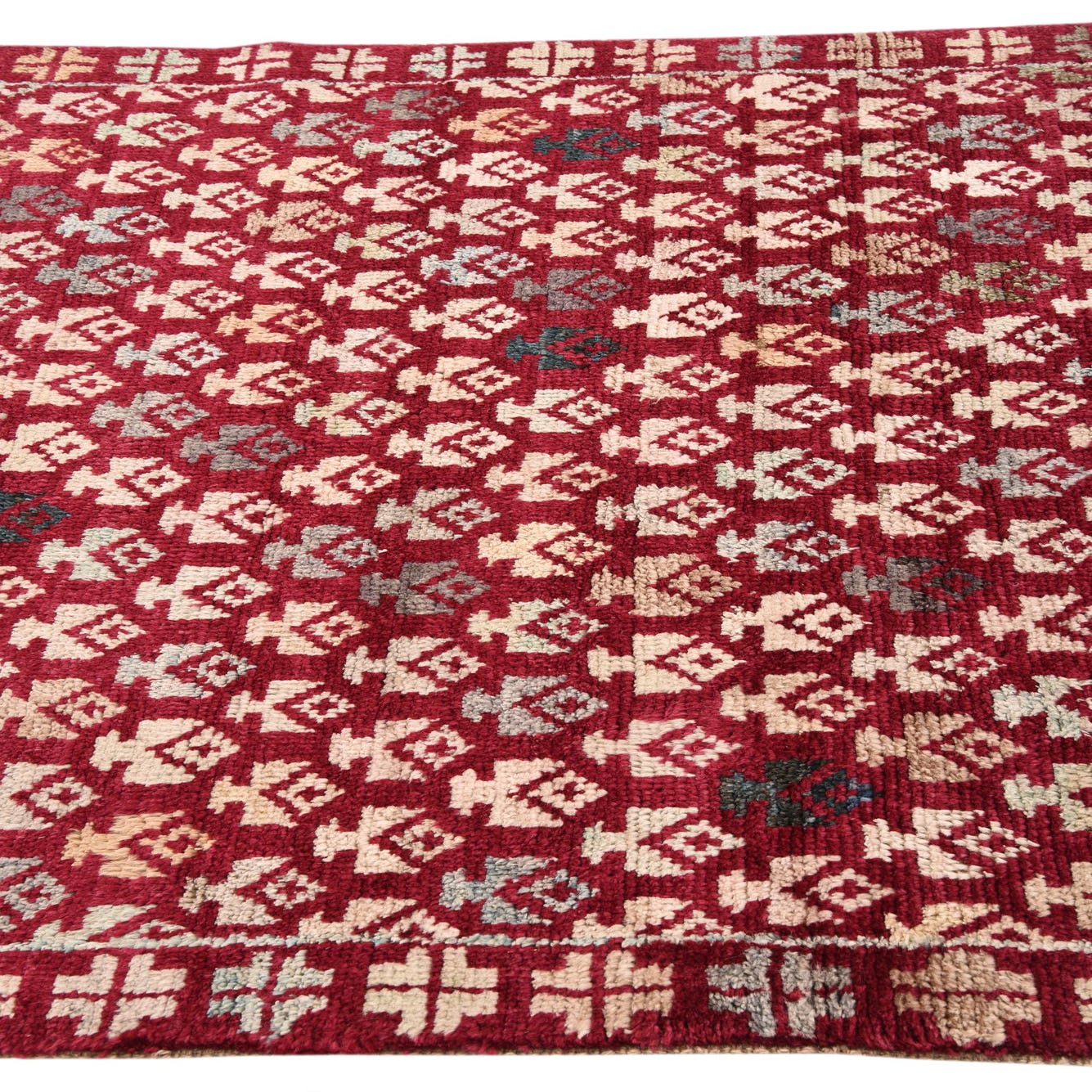 A 4x6 rectangular Balouch rug with a deep red background and repeating tribal motifs in cream, grey, and subtle green, perfect for an indoor living space.