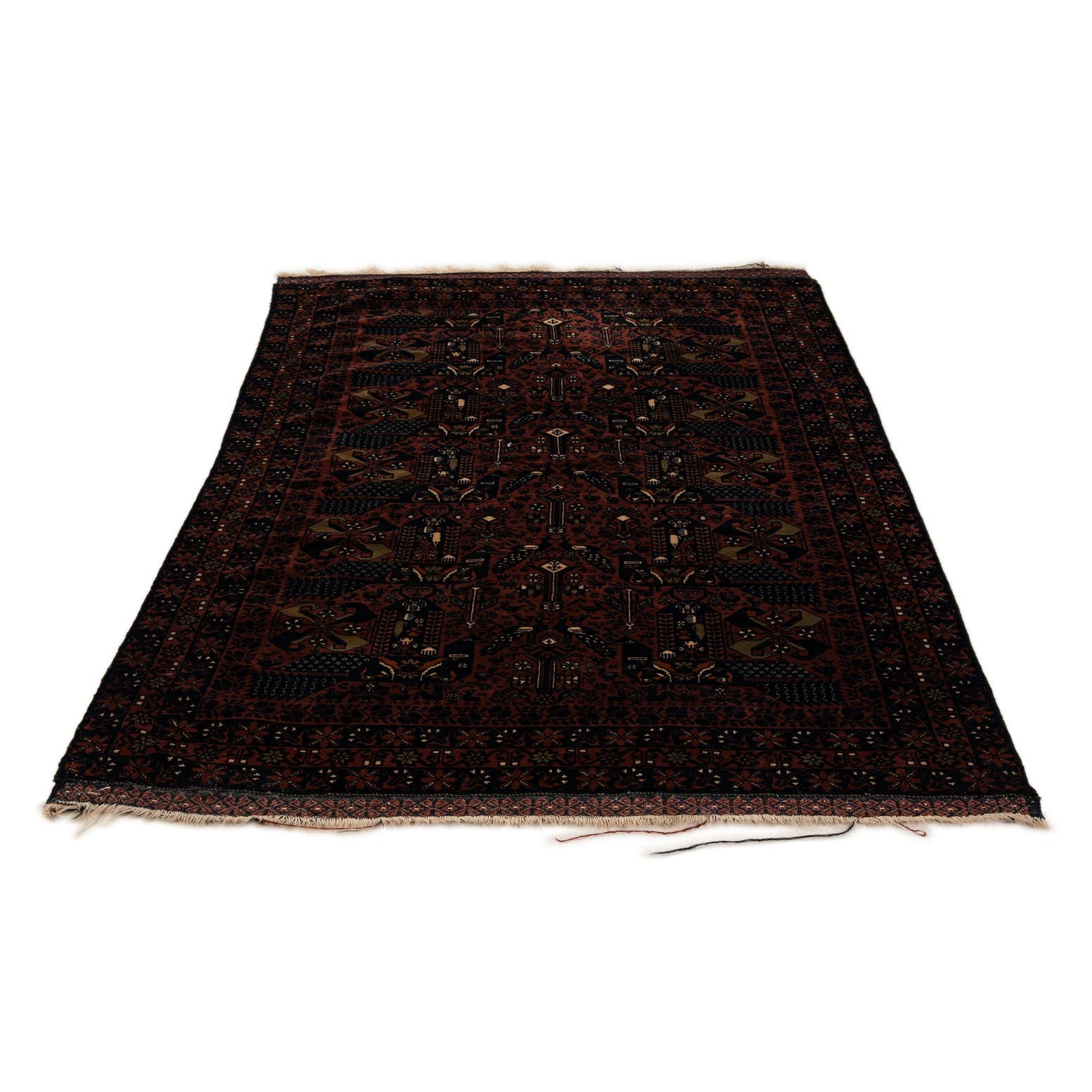 Primary color is Burgundy. Colors in this rug include: Burgundy, Olive, Navy Blue, Ivory.