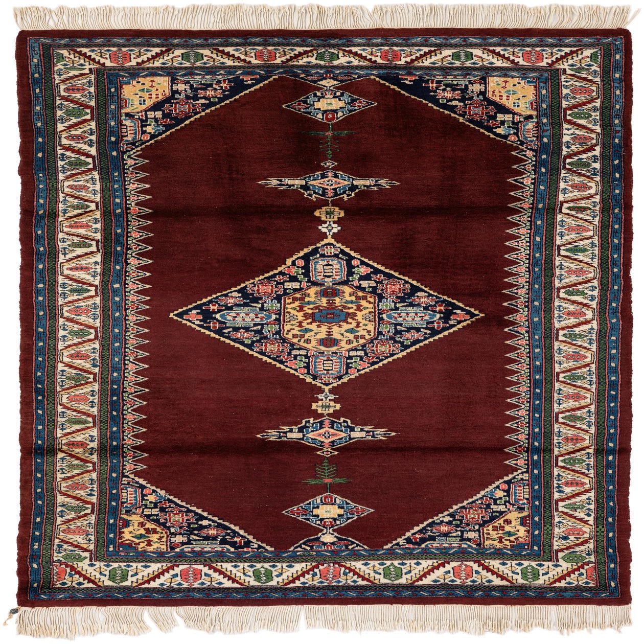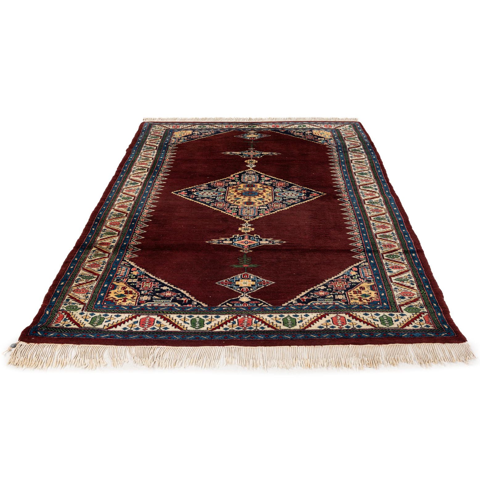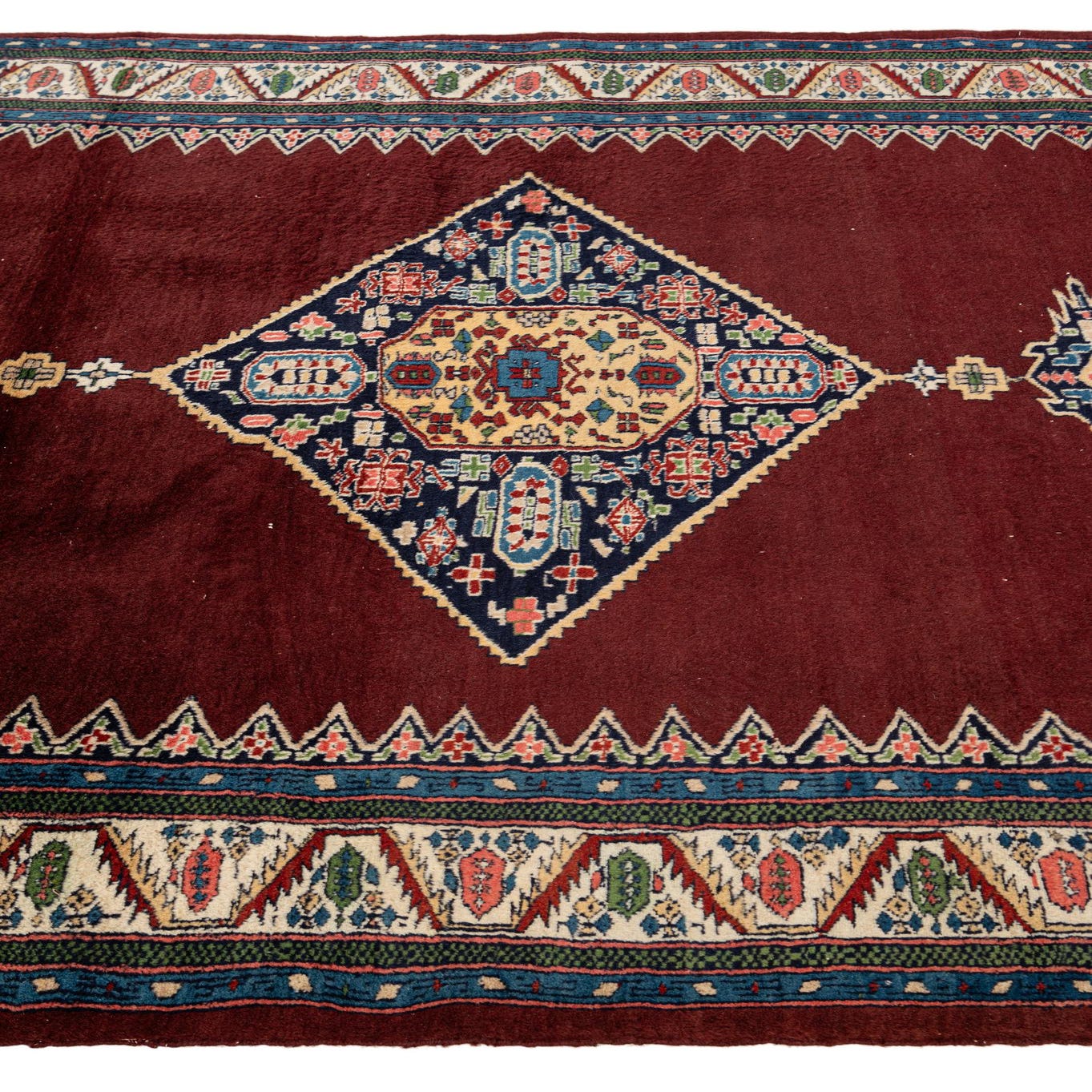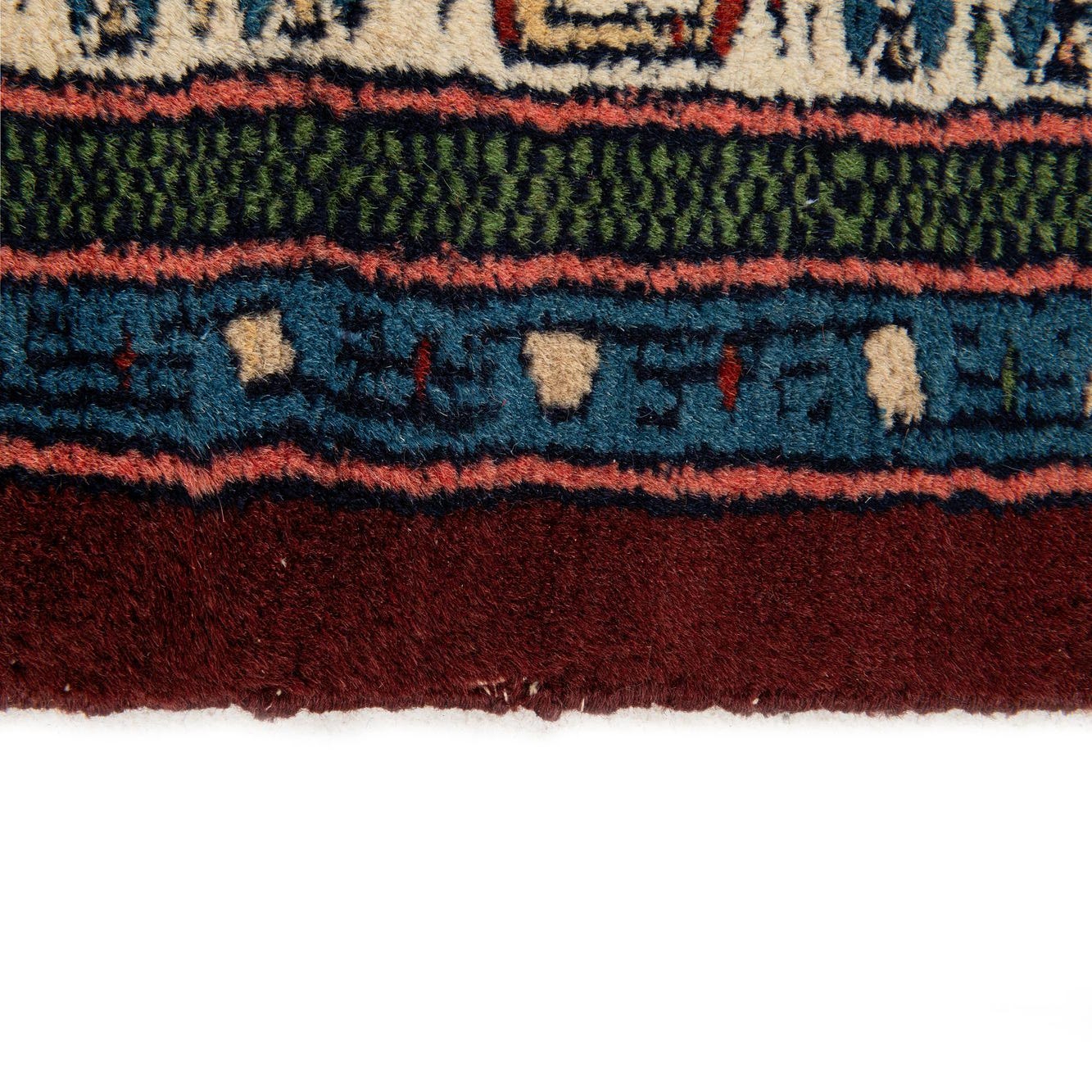 Primary color is Burgundy. Colors in this rug include: Burgundy, Green, Ivory, Light Blue, Navy Blue, Red, Pink, Tan.