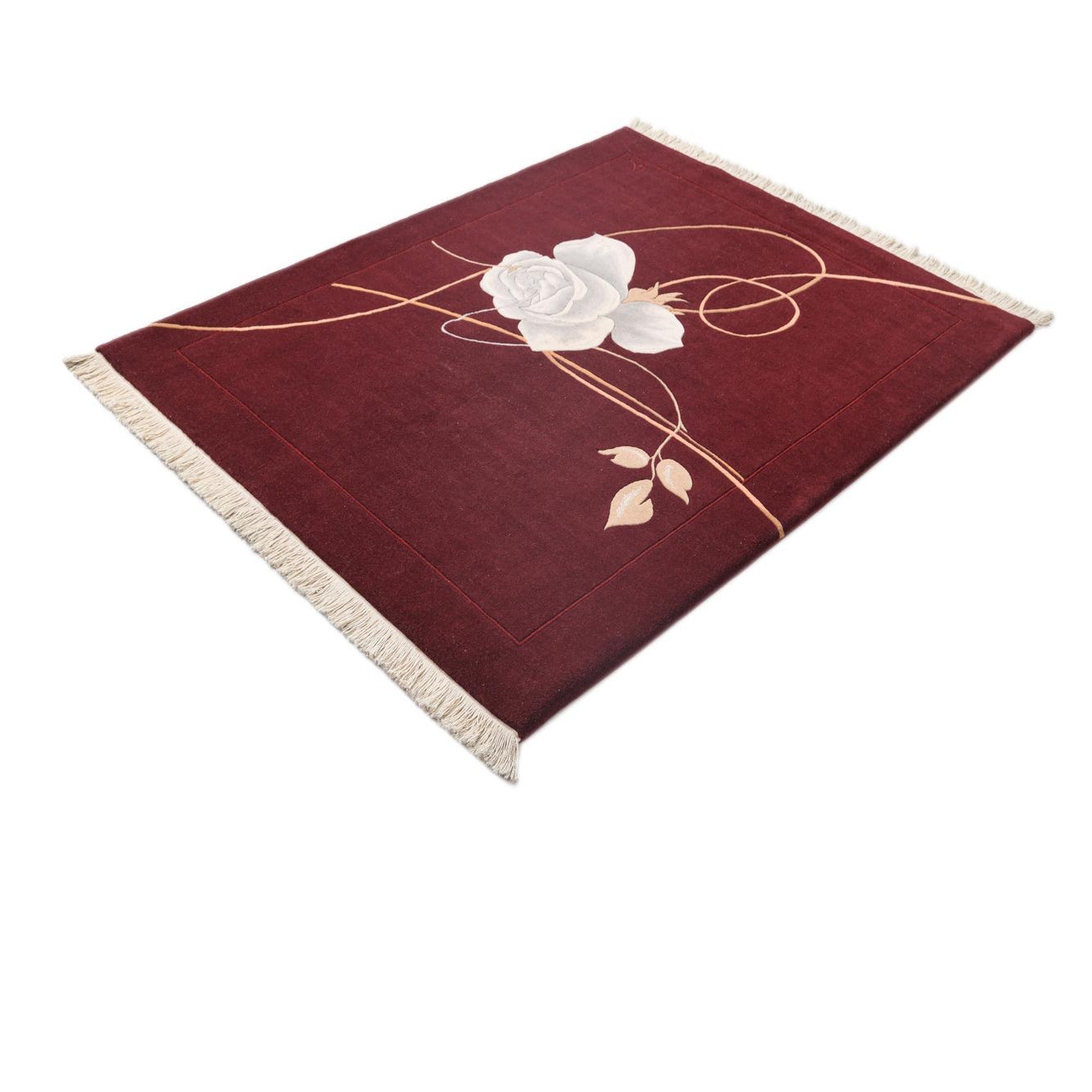 A 4x6 rectangular red wool rug with a large white rose and golden leaves and vines, featuring a high pile and fringe.