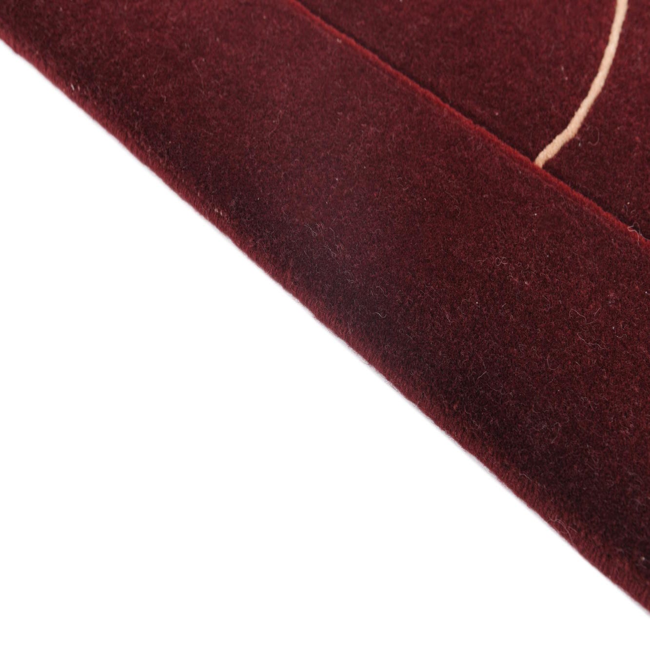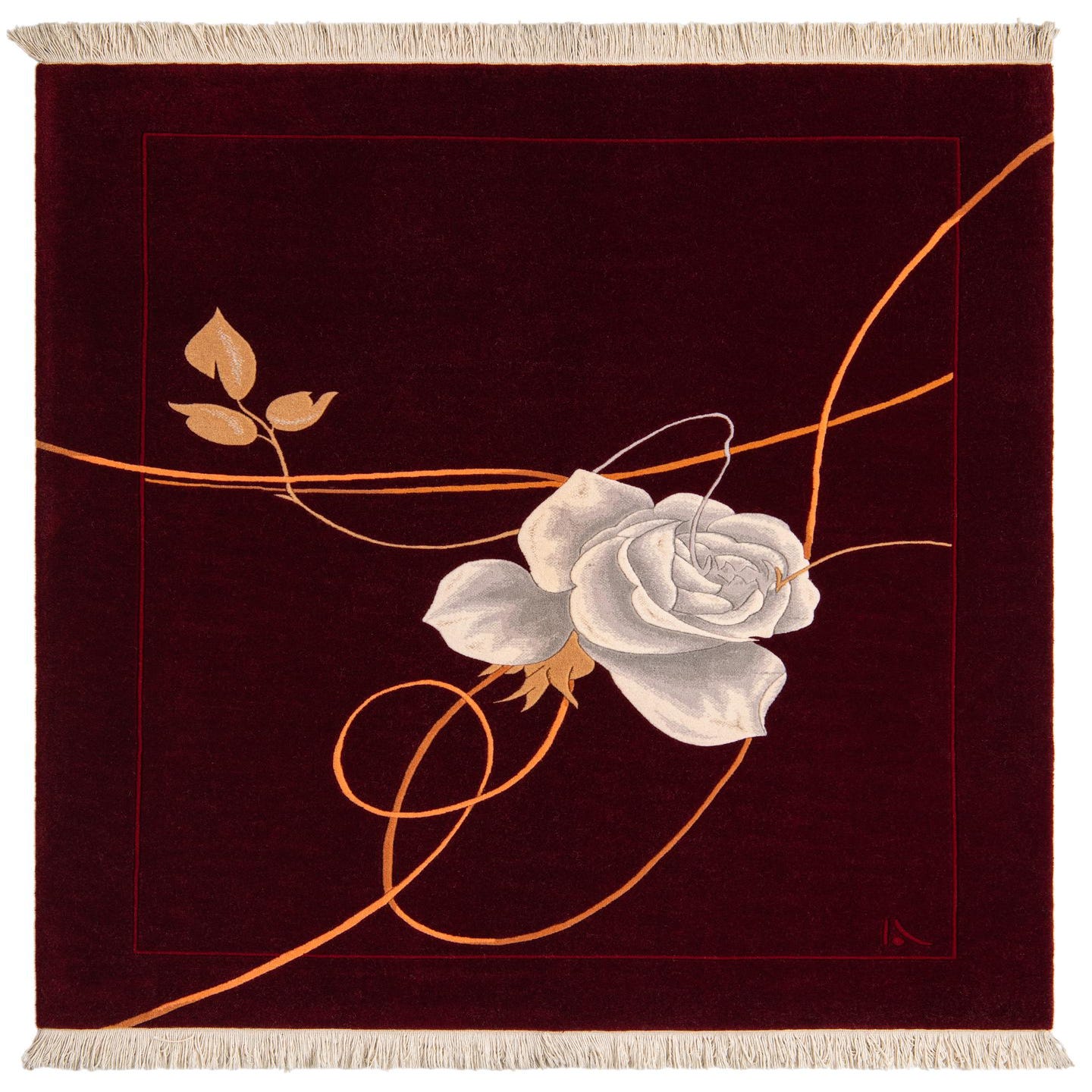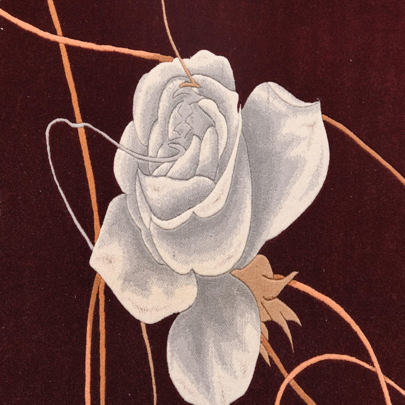 A deep burgundy field provides a rich, even canvas for a single, sculpted rose rendered in soft ivory and cool gray, its petals detailed with subtle shading. Sinuous orange and light-brown vines thread across the face of the rug, punctuated by beige leaves and a fine red inner border that quietly frames the composition. The composition blends classic floral imagery with a modern, slightly abstract layout—an elegant balance between traditional and contemporary sensibilities.