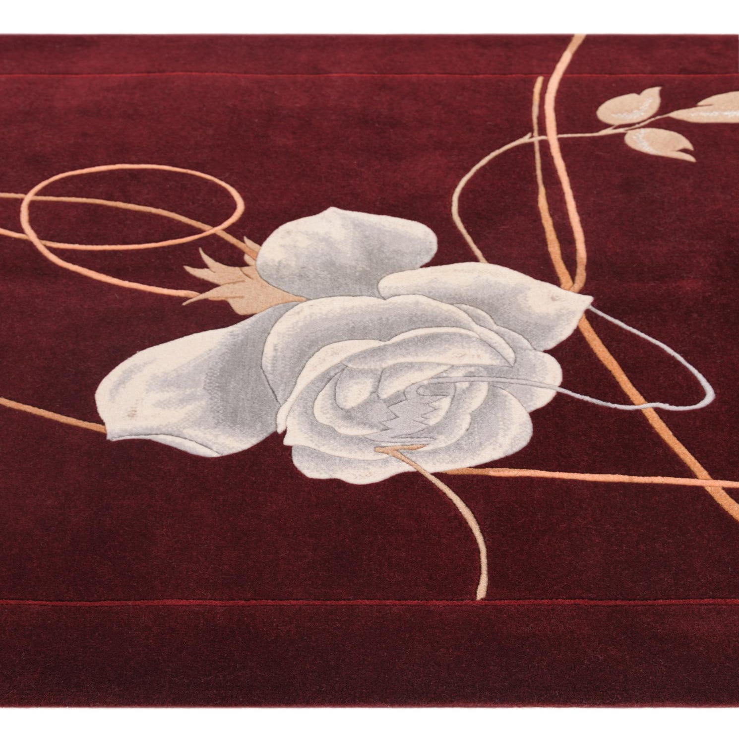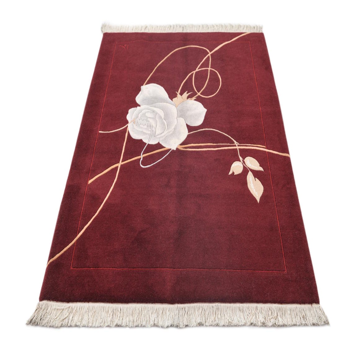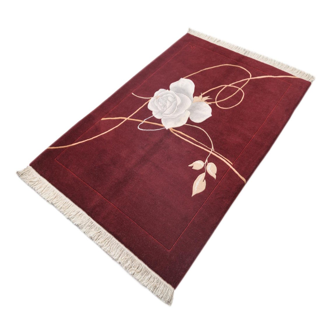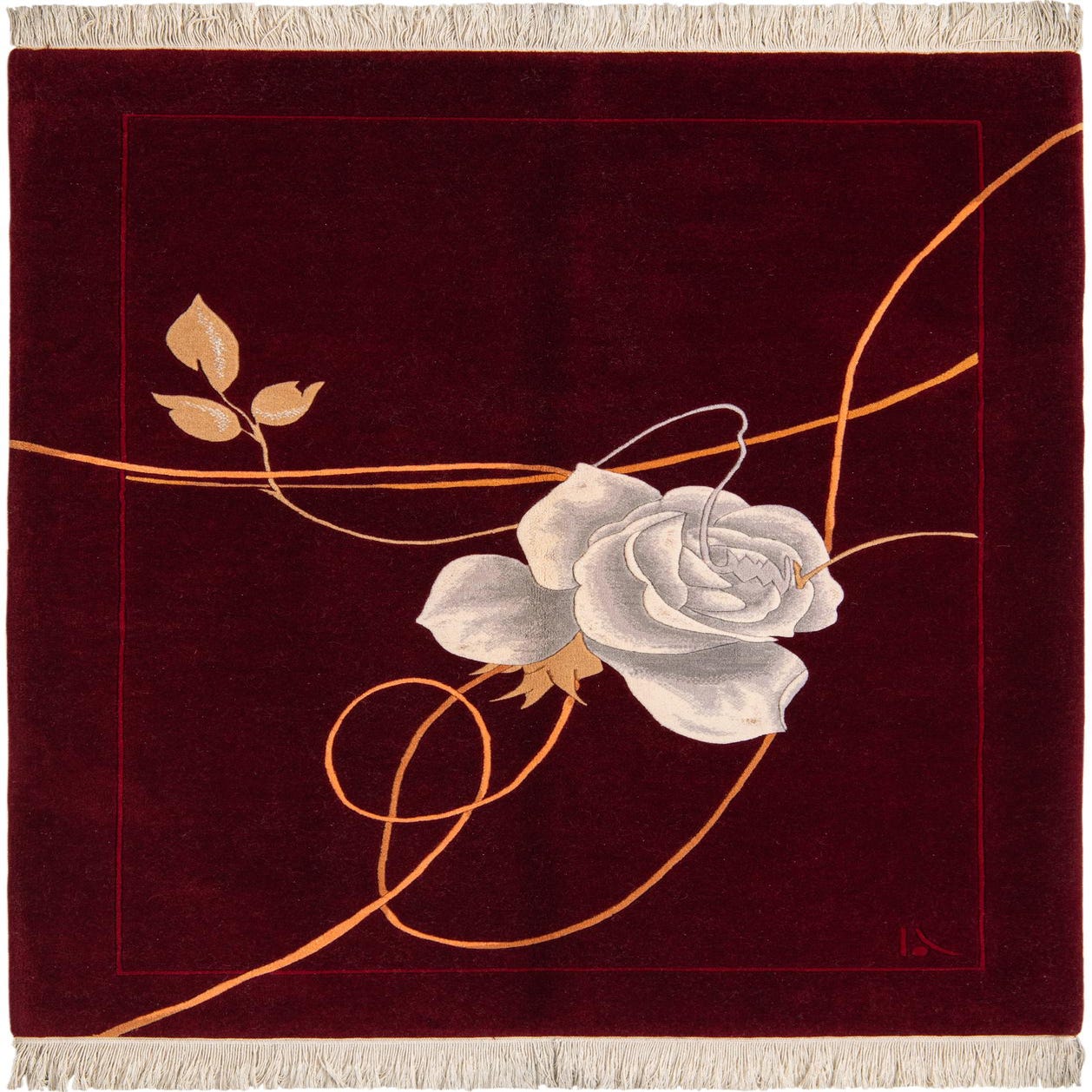 A 4x6 rectangular Darya rug in deep red with a large white rose and golden leaves and vines.