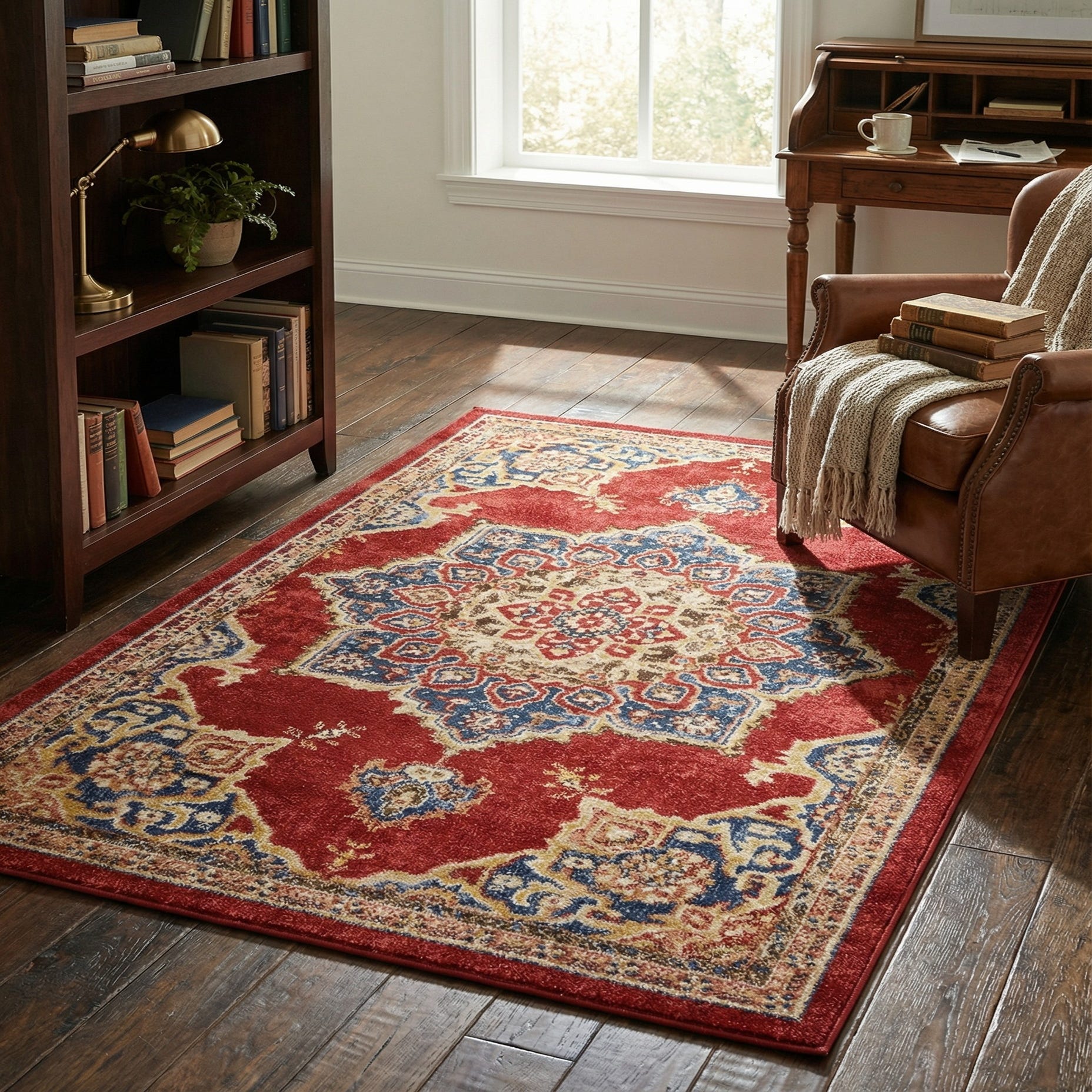 This rug works well as an anchor in a living area, a warm addition to an entry or hallway, or layered at the foot of a bed to introduce color and pattern. Pair it with warm wood furniture, navy or cream upholstery, and metal accents in brass or aged iron for a traditional or transitional look; it also complements eclectic or bohemian schemes when combined with mixed textiles and layered patterns.