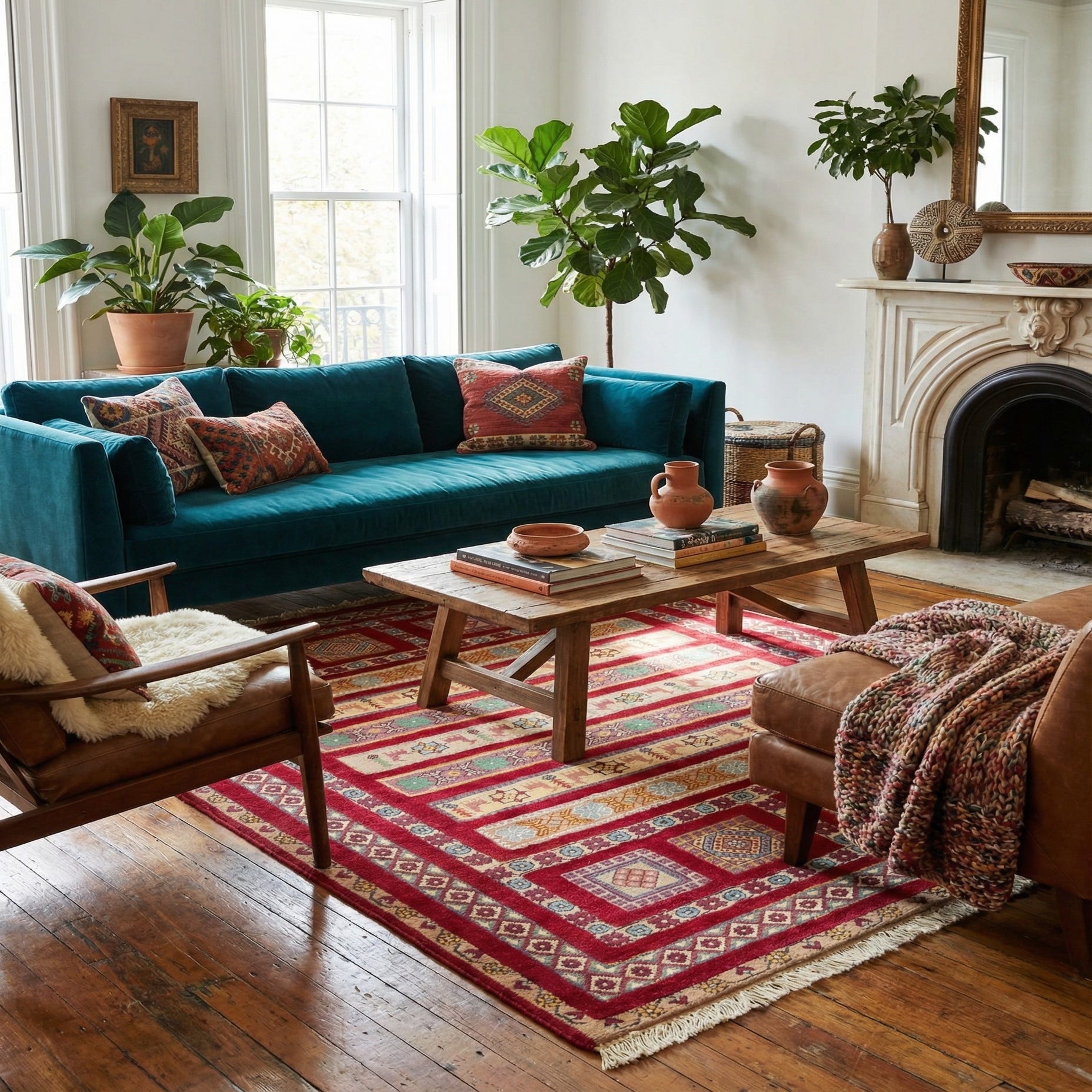 This Ghoochan rug would effortlessly fit into spaces that favor rich tones and timeless design elements, such as classic, traditional, or eclectic interiors. Its robust palette could complement wooden furniture and neutral settings to add a focal point, or harmonize with more vibrant decors by tying in the various hues present within the piece. Whether placed in a living room, dining area, or study, this rug exudes a sense of warmth and refined style.