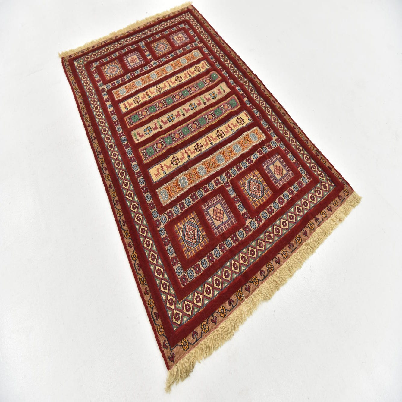 A 4x6 rectangular red Persian rug with a tribal pattern, featuring colorful stripes and geometric motifs.