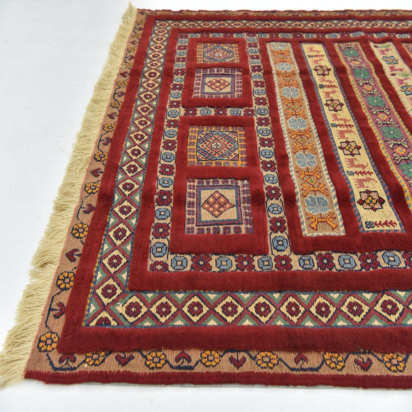 Framed by a series of intricate borders, the central field is structured into panels that showcase varying patterns, each meticulously constructed to create a harmonious visual experience. The thoughtful use of color throughout these patterns highlights the rug's depth and complexity. Completing the traditional aesthetic, a fringe adds a classic touch to the rug's edges.