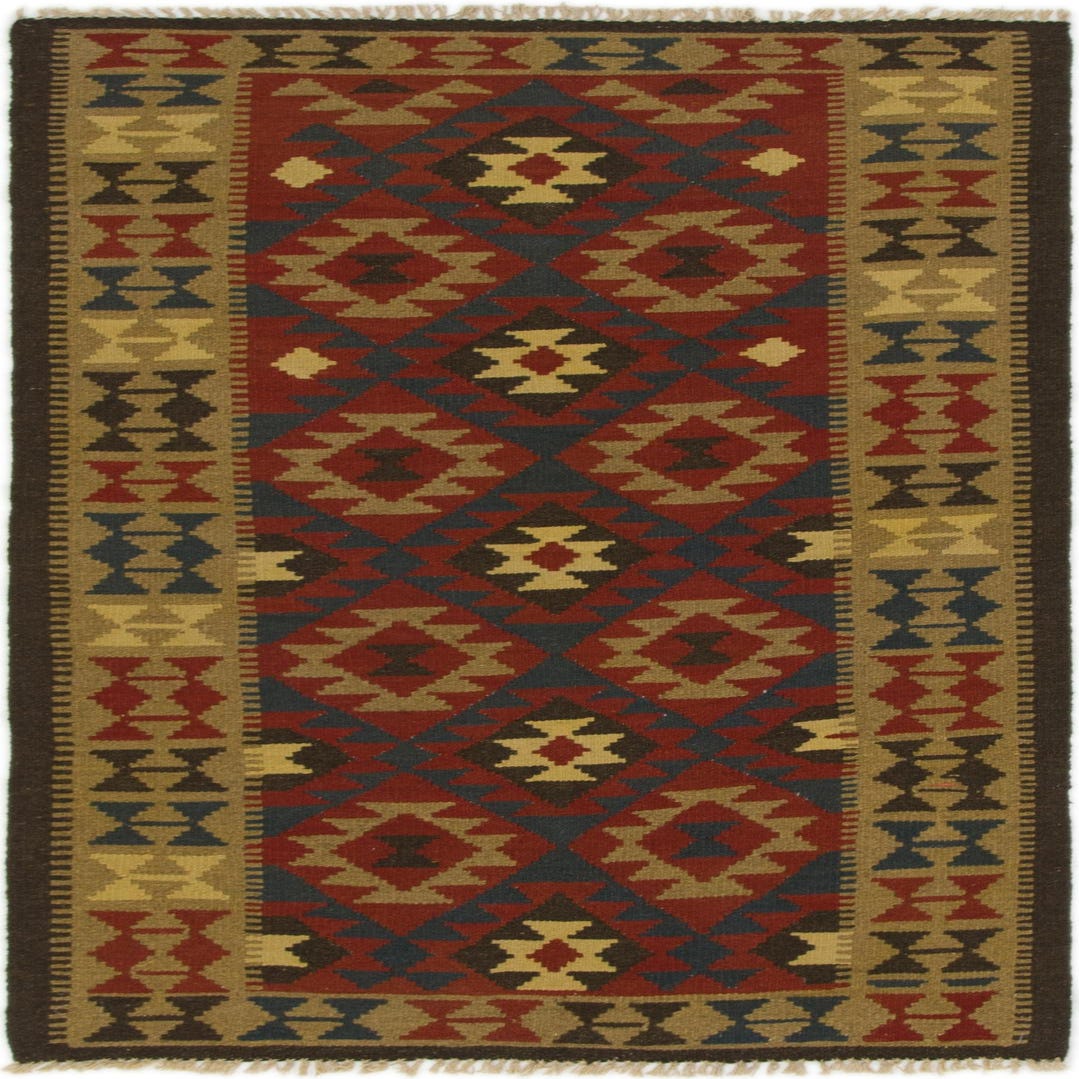 A 4x6 rectangular Kilim Maymana rug with a Southwestern and Tribal pattern in reds, blues, and gold.