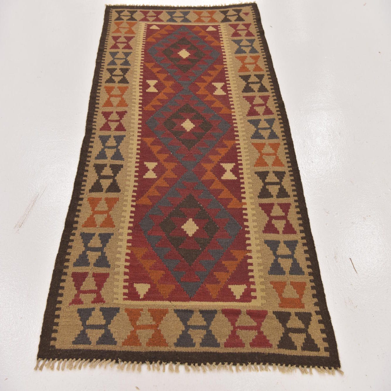A bold burgundy field anchors a row of stacked diamond medallions and stepped-triangle motifs in navy blue, brown, ivory, orange and beige. The design follows a traditional kilim vocabulary with a narrow sawtooth inner guard and a wider beige border punctuated by repeating hourglass-like motifs. The flatweave surface is hand-woven from 100% wool, offering a low-pile, tightly woven texture that feels substantial underfoot with the slightly firm, natural feel of wool fibers and a soft, hand-tufted edge of short fringe at each end.