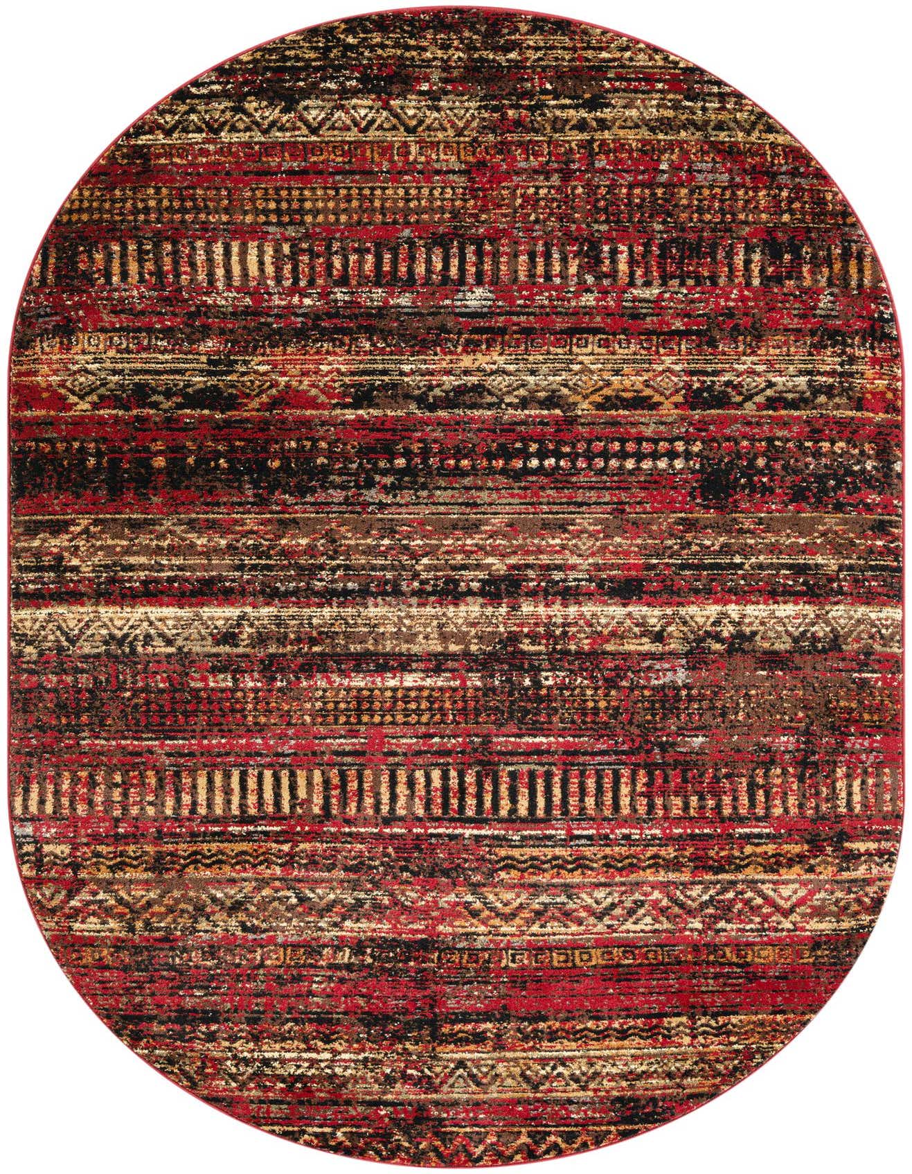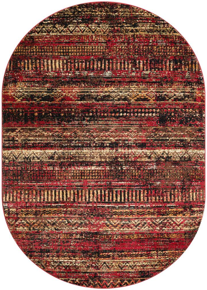 The Saturn Collection offers a versatile oval polypropylene rug measuring 4x6 feet, designed to enhance a variety of living spaces. The rug boasts a rich burgundy background, elegantly complemented by a diverse color palette that includes beige, black, brown, light brown, and maroon. Its pattern features an intricate blend of traditional motifs and abstract elements, creating a visually engaging aesthetic.