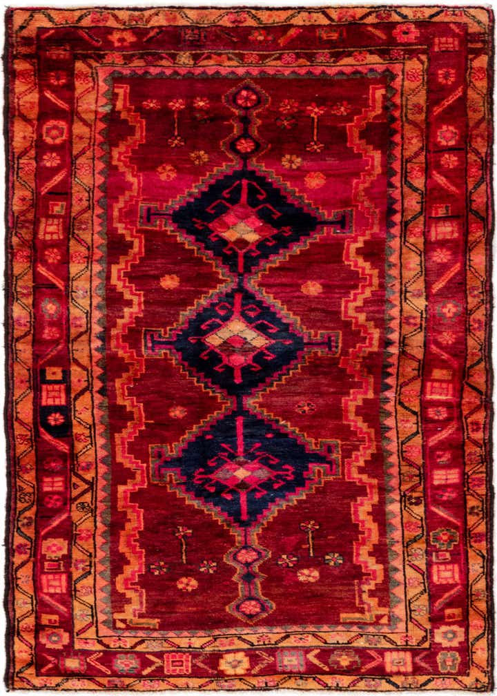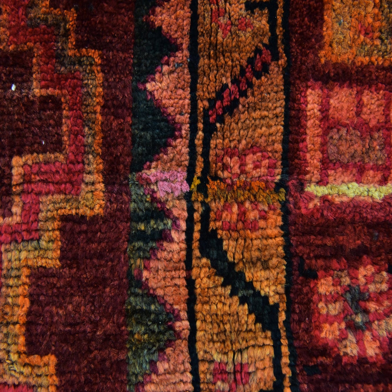 Primary color is Burgundy. Colors in this rug include: Burgundy, Black, Ivory, Navy Blue, Pink, Gray, Orange.