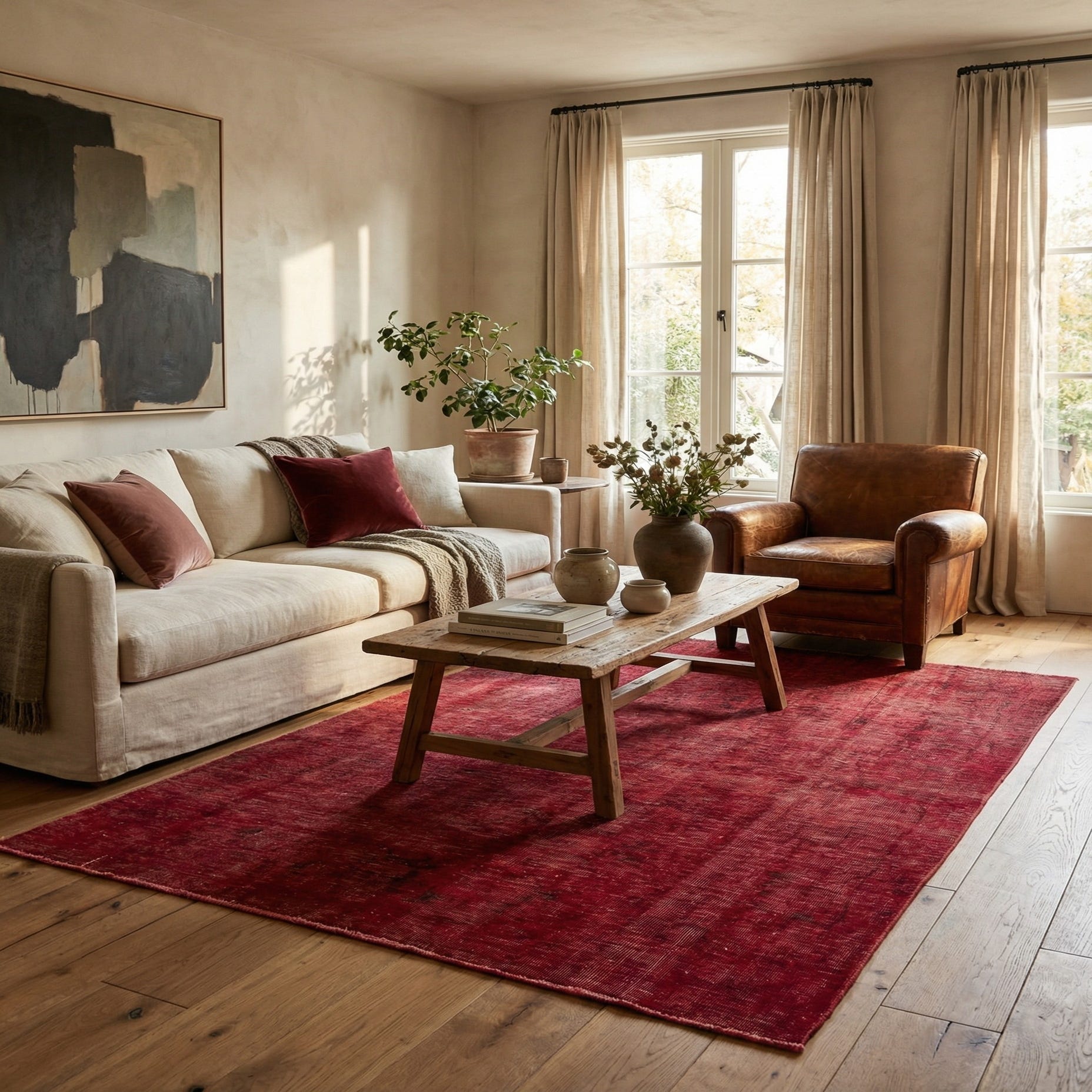 A 4x6 rectangular Ultra Vintage rug in deep red with subtle black abstract Persian patterns, ideal for a living room.