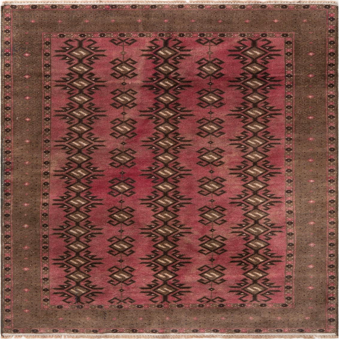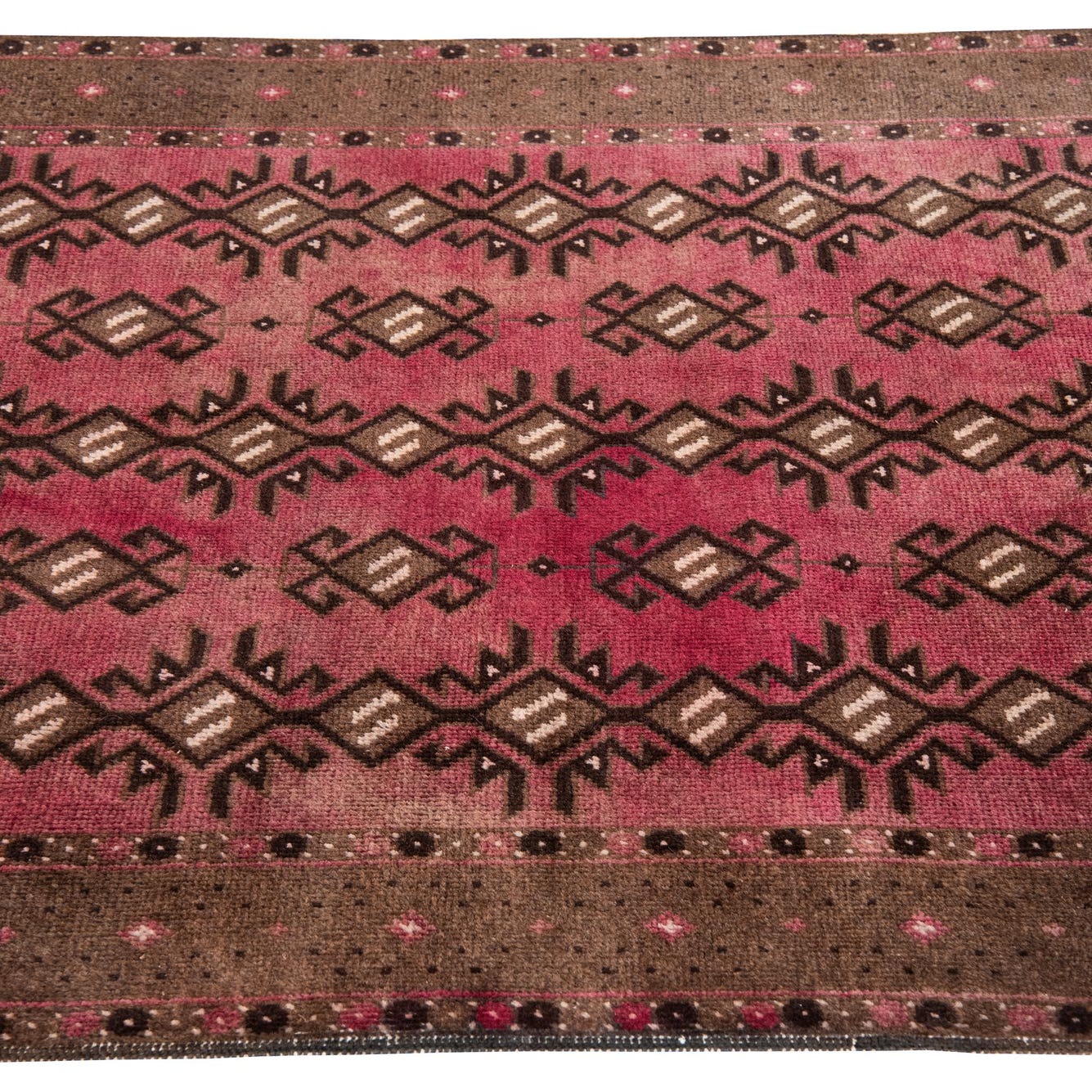The Ultra Vintage collection presents a hand-knotted rug that features a rich tapestry of burgundy, brown, and ivory hues. Expertly woven from 100% wool, this piece showcases a bold and structured geometric pattern that employs diamond motifs in a symmetrical arrangement, contrasted against the deep burgundy background. Measuring 4x6 feet, it is framed by a complementary border that echoes the palette and design elements seen in the field.