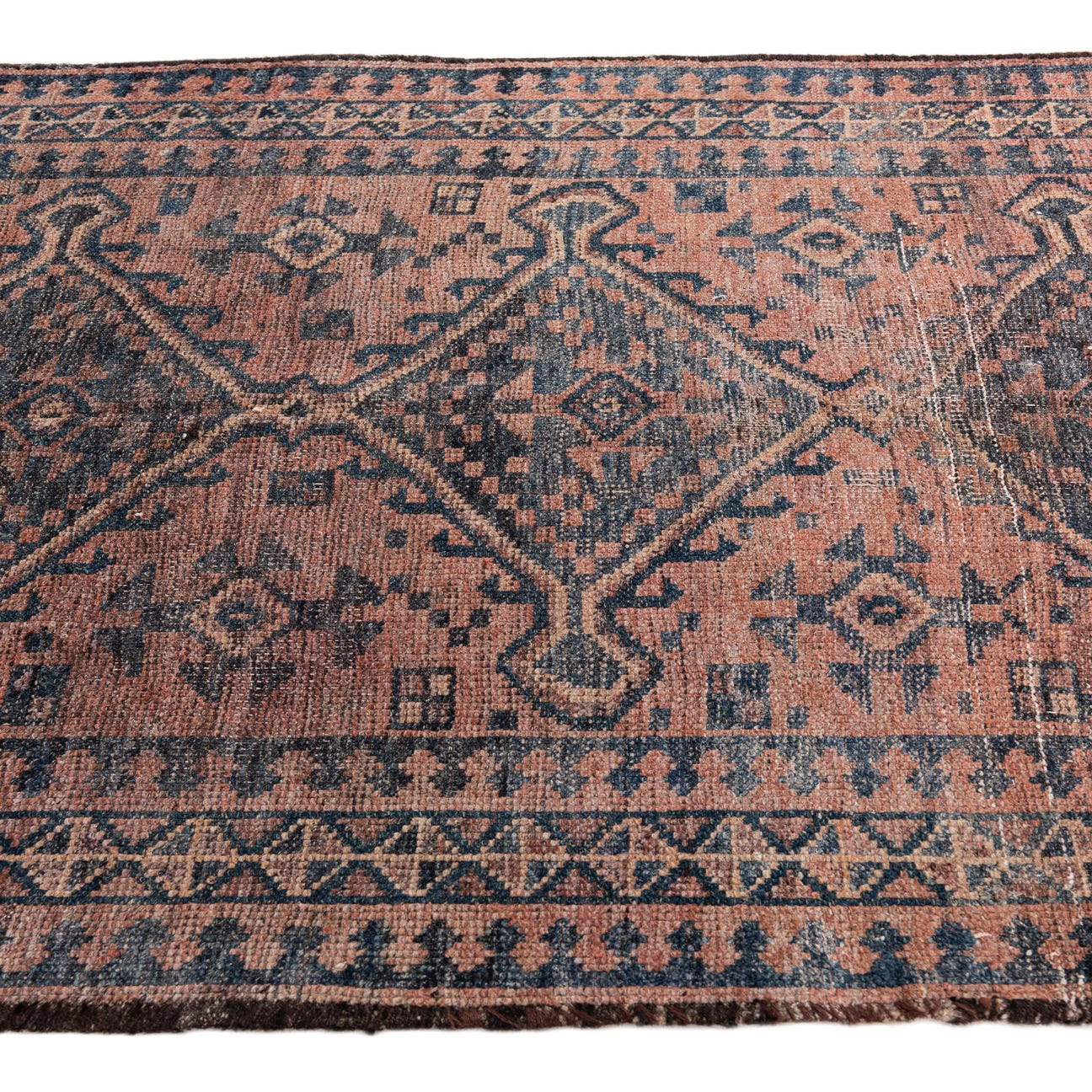 A timeworn, geometric design centers three elongated diamond medallions down the length of the rug, surrounded by a narrow, patterned border of repeating triangles and small rosette motifs. The background is burgundy, with navy blue defining the medallions and field details, brown providing subtle outlines and depth, and beige highlights that soften the overall palette. Hand-knotted in 100% wool, the pile is dense and low with a gently worn surface you can feel beneath your feet—soft to the touch with a slight nap that adds subtle texture to the pattern.