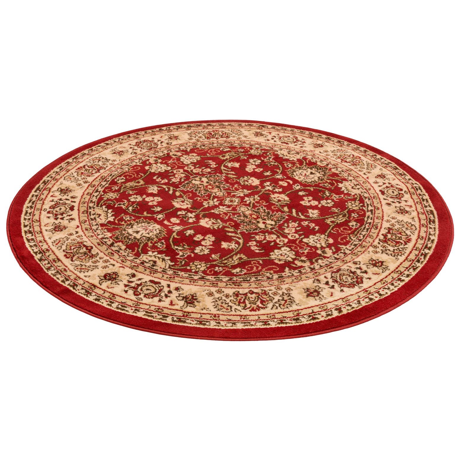 A 5' 3 round red traditional rug with an ornate floral and oriental pattern in cream and gold, suitable for indoor spaces.