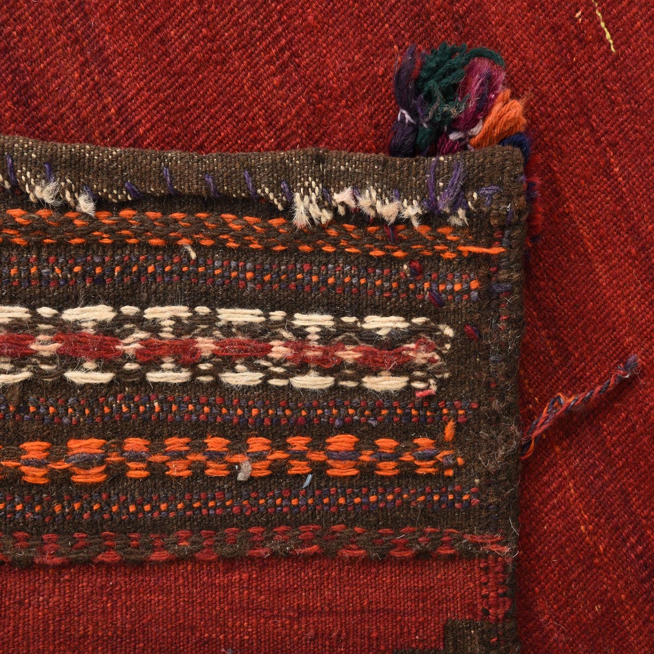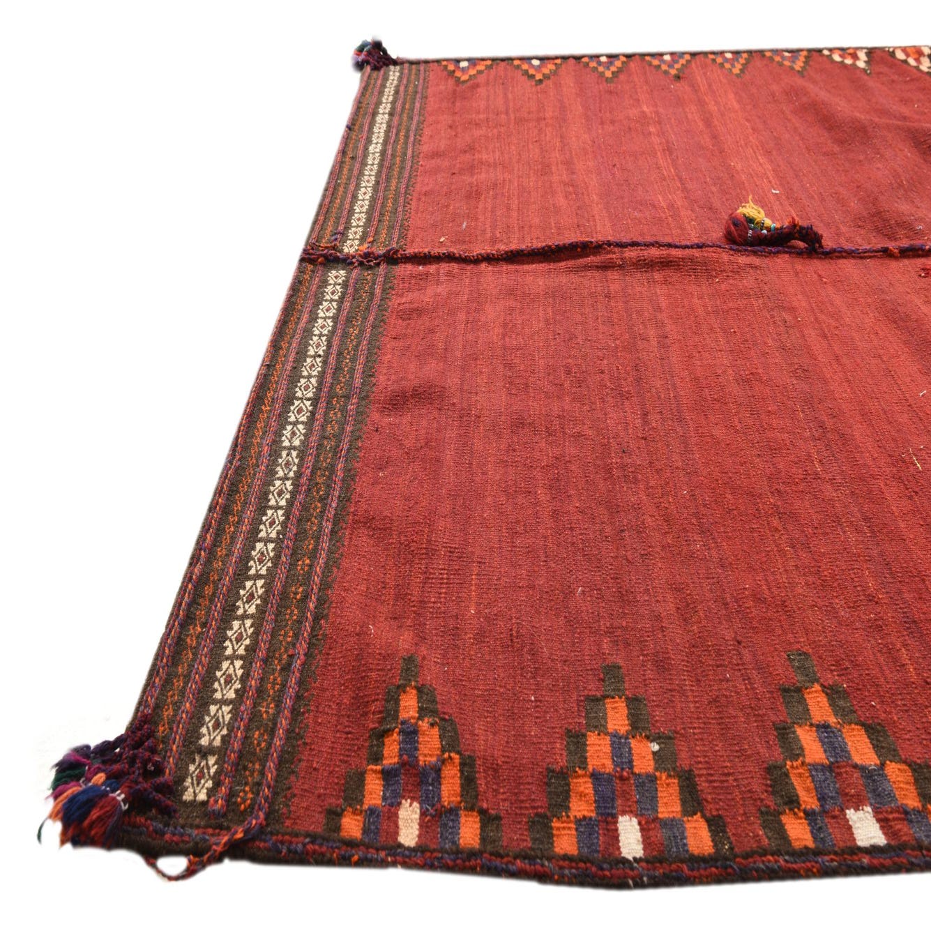 A 5' 0 x 5' 2 square red Kilim Fars flatweave rug with tribal patterns and tassels.