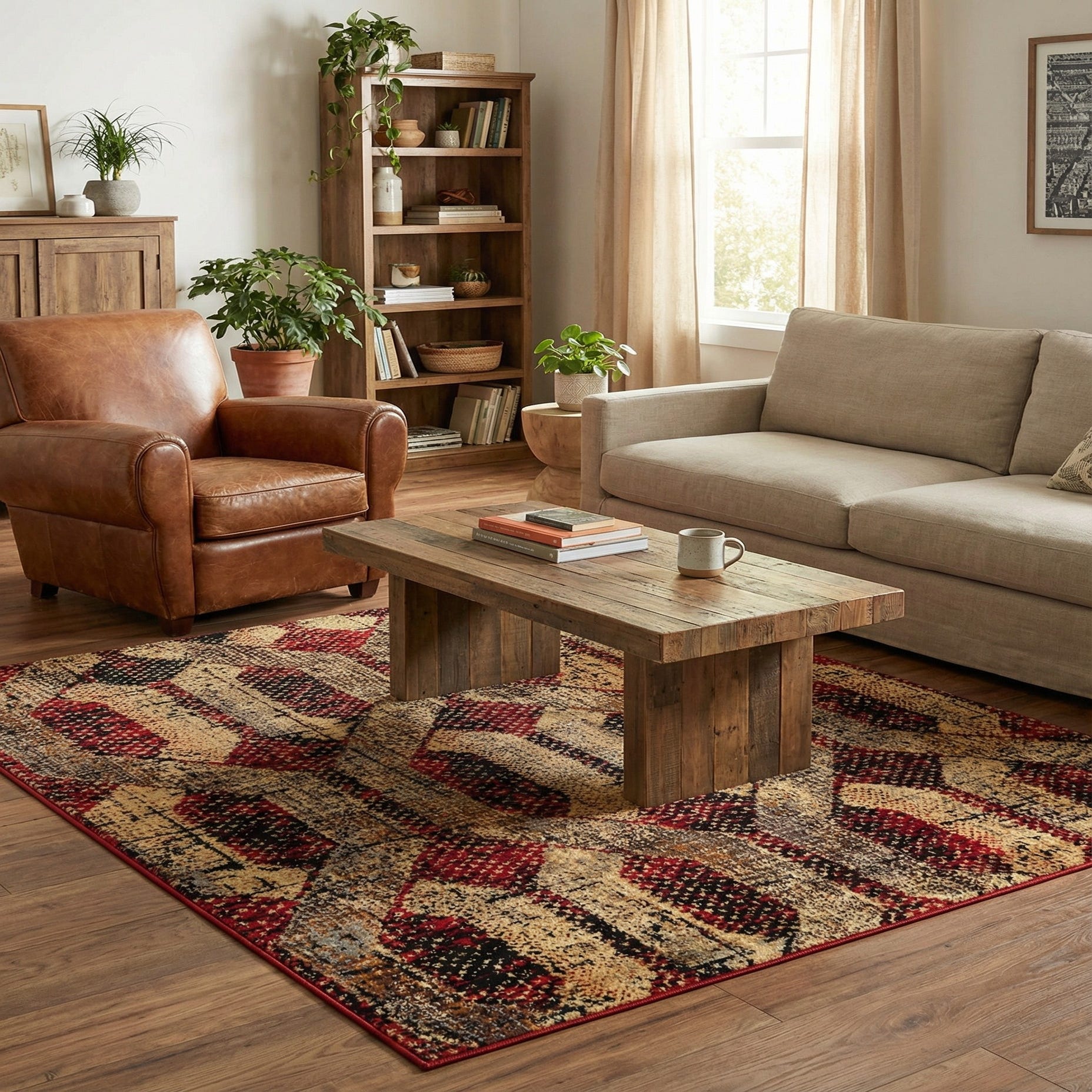 Warm, versatile tones and a balanced pattern suit a range of interiors: place it under a coffee table to define a living area, beneath a dining table for added color and structure, or in a home office to introduce layered texture. It pairs nicely with dark wood or leather furnishings, brass or black metal accents, and both transitional and industrial schemes — or layer it over a larger neutral rug to create a cozy focal point in an open plan space.