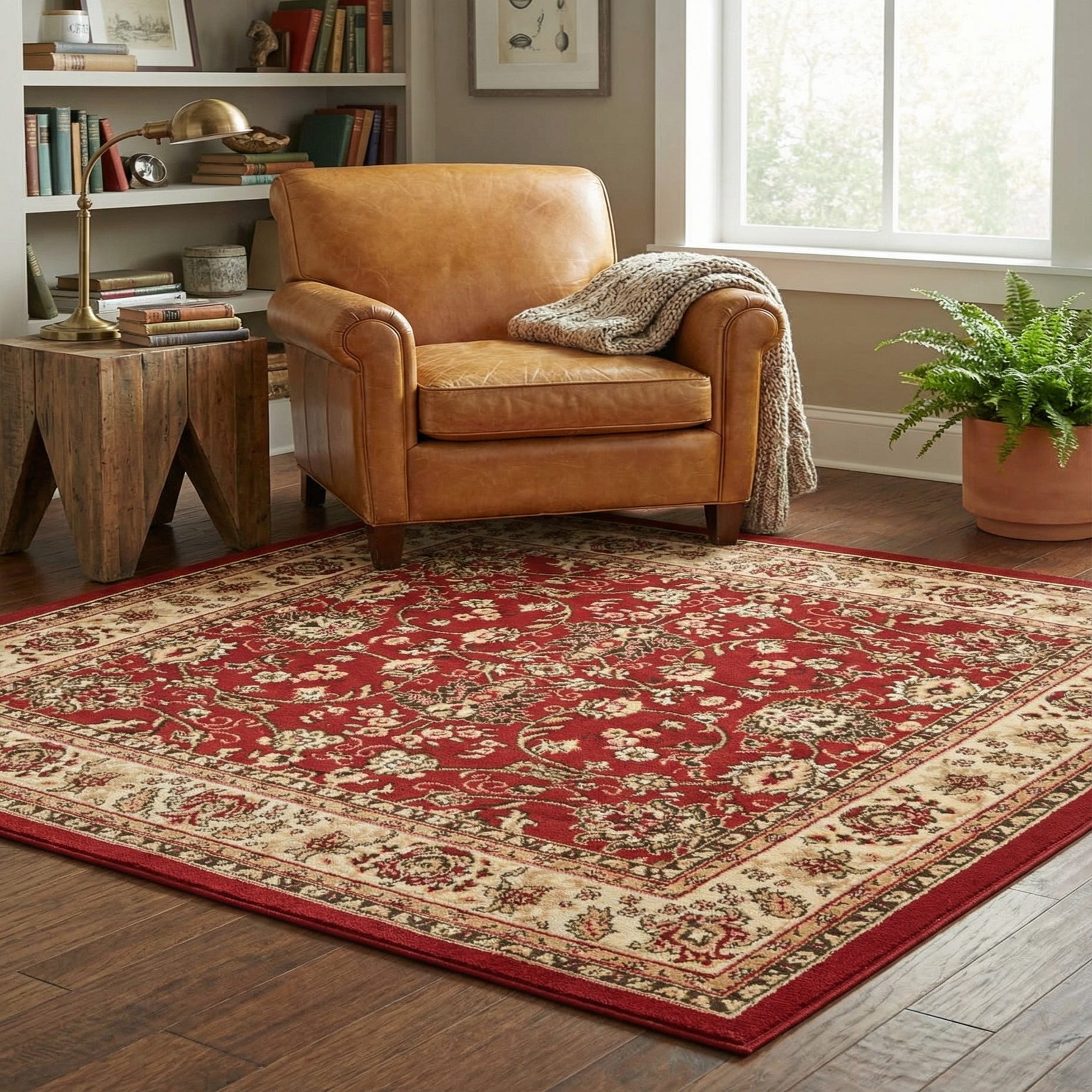 The Yasmin Collection presents a 5 Ft Square rug machine woven from 100% polypropylene, designed to offer both durability and comfort underfoot. This piece showcases a rich burgundy background accentuated by a timeless pattern featuring detailed floral and scrollwork motifs in hues of beige, brown, and cream. The balanced use of colors presents a harmonious aesthetic that can enhance various interior spaces.