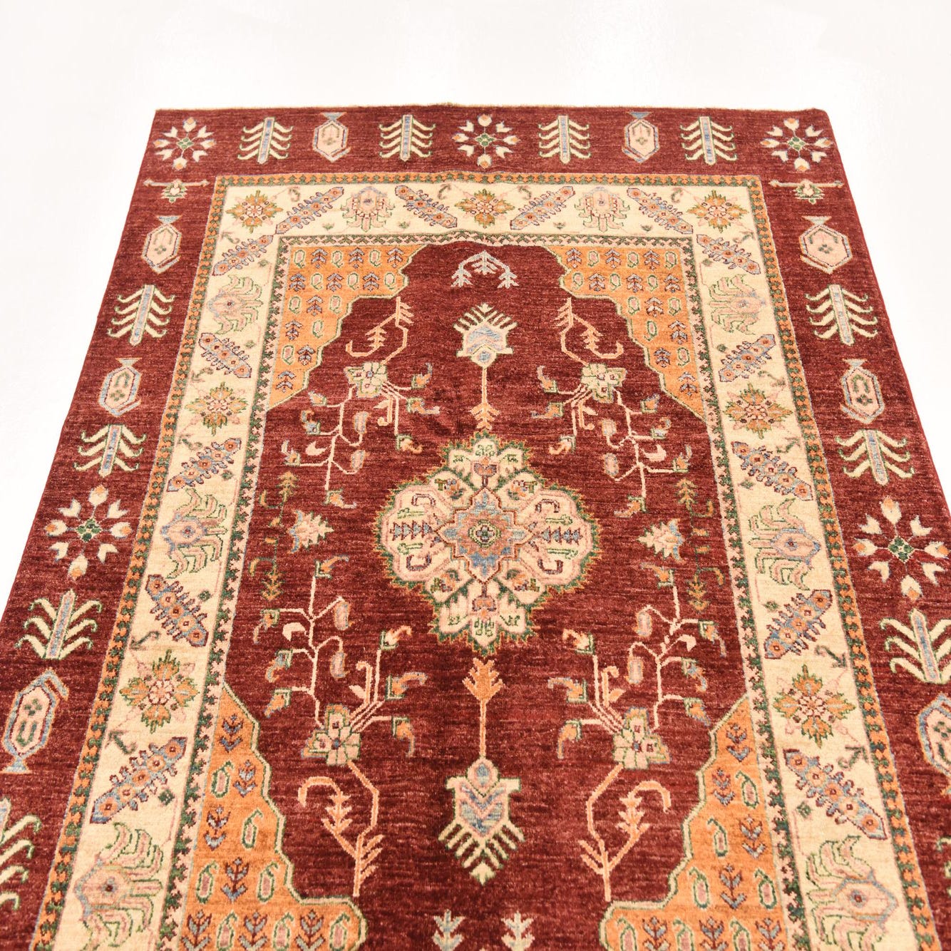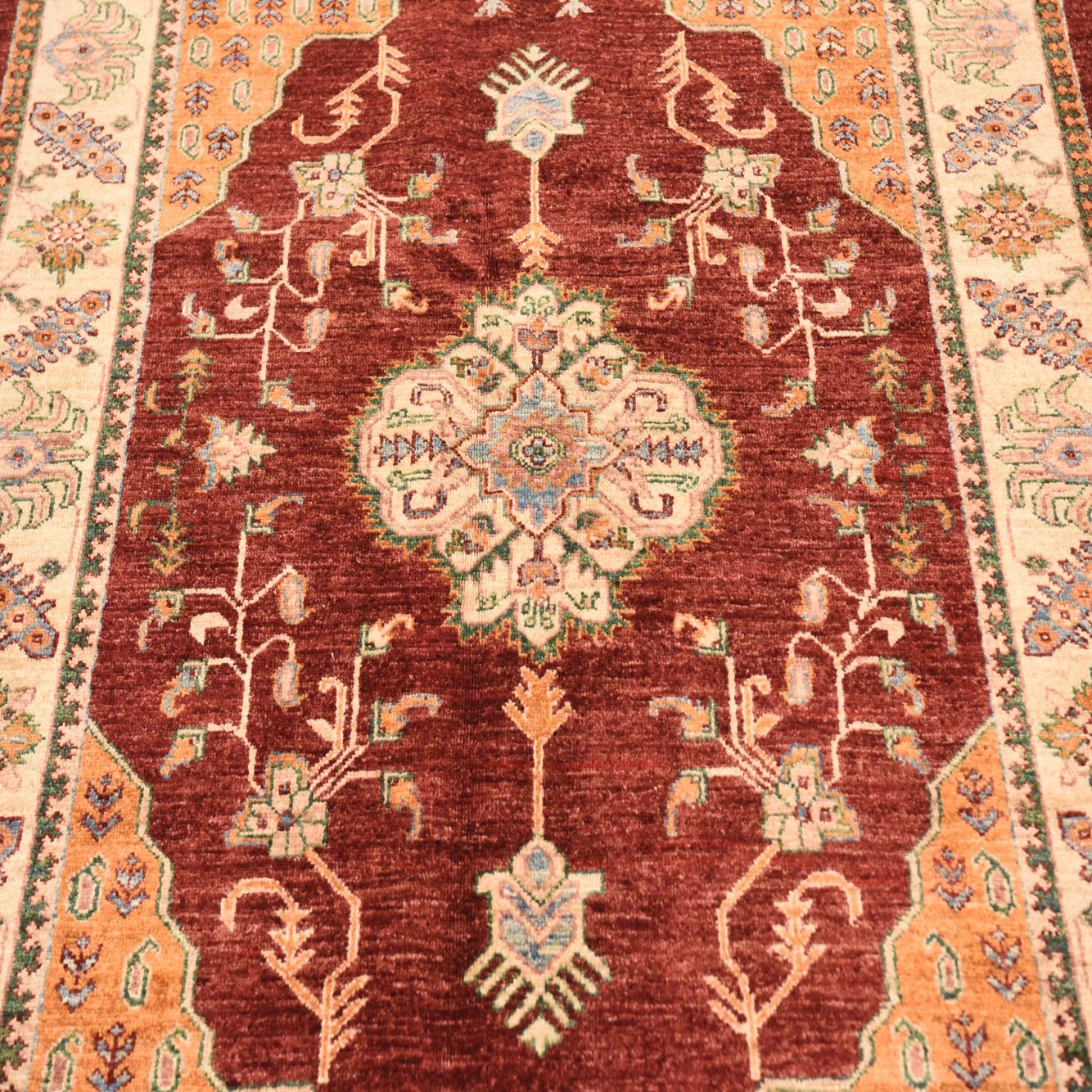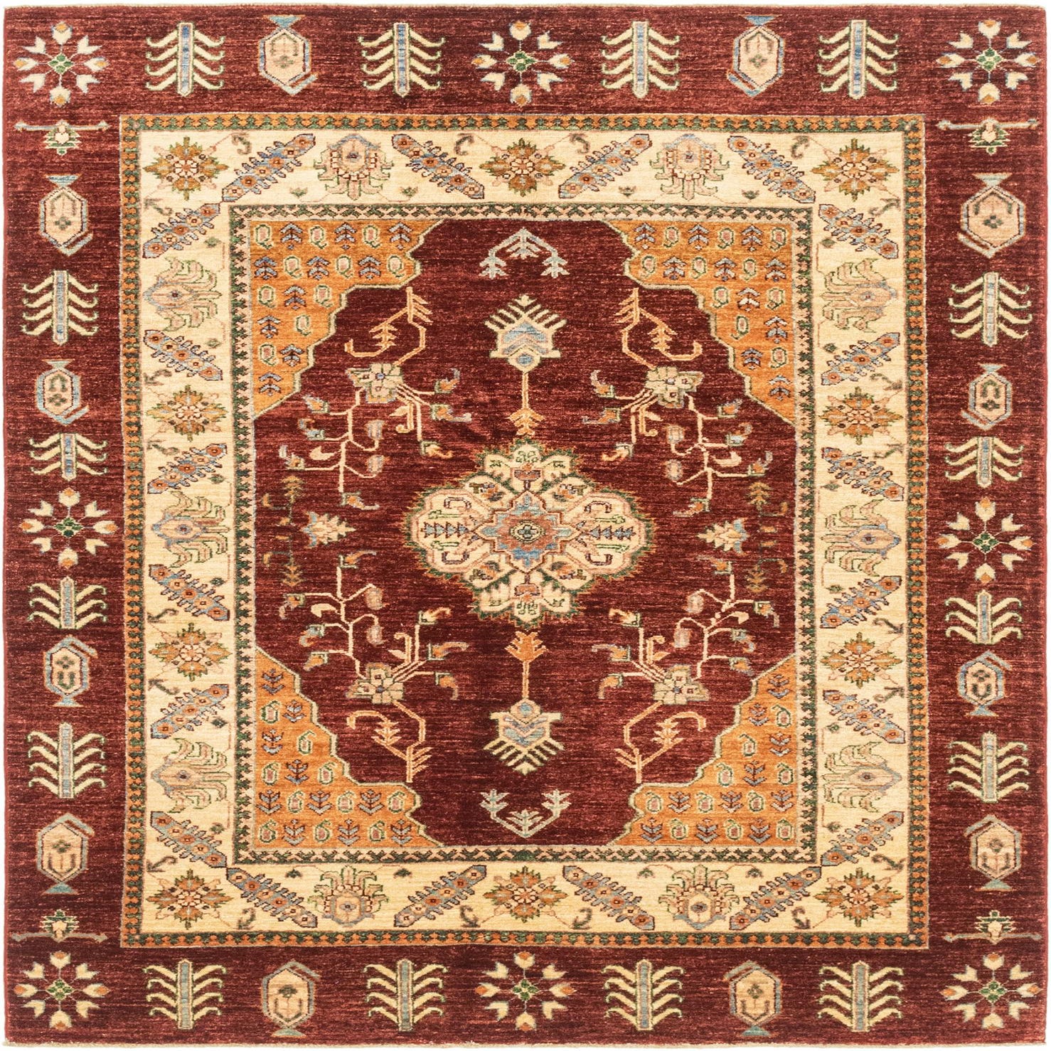The Ariana Ziegler collection presents a hand-knotted rug of 100% hand-spun wool that measures 5x7 feet. This piece showcases a deep burgundy background accented with a rich palette of black, blue, brown, cream, hunter green, orange, and red. The traditional design features a central medallion surrounded by intricate floral and geometric motifs, creating a sense of elegance and historical depth.