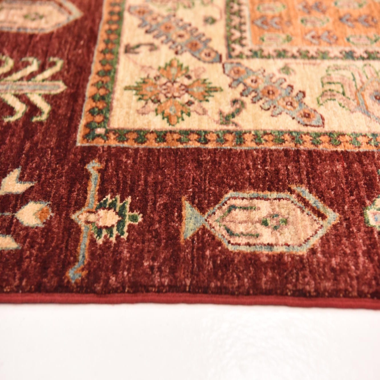 Primary color is Burgundy. Colors in this rug include: Burgundy, Black, Blue, Brown, Cream, Hunter Green, Orange, Red.