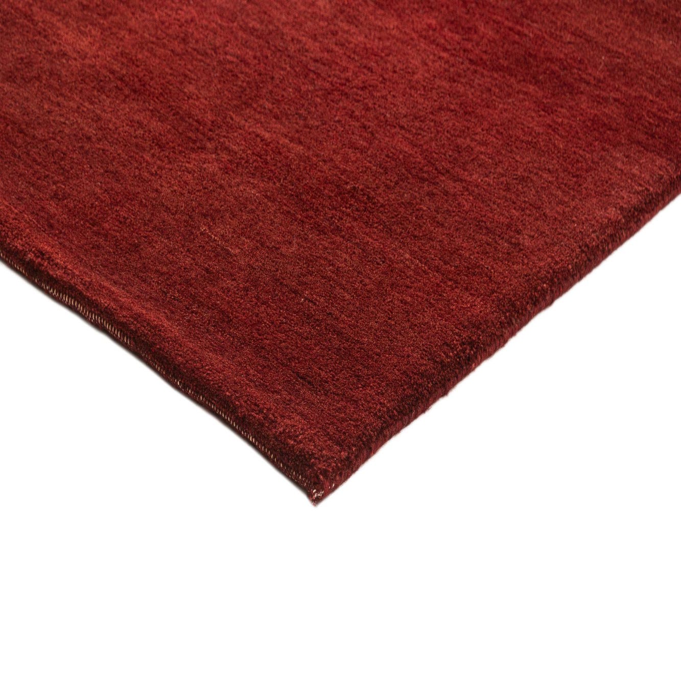 A 5x7 rectangular Gabbeh rug in deep red wool with a subtle modern pattern, suitable for indoor spaces.