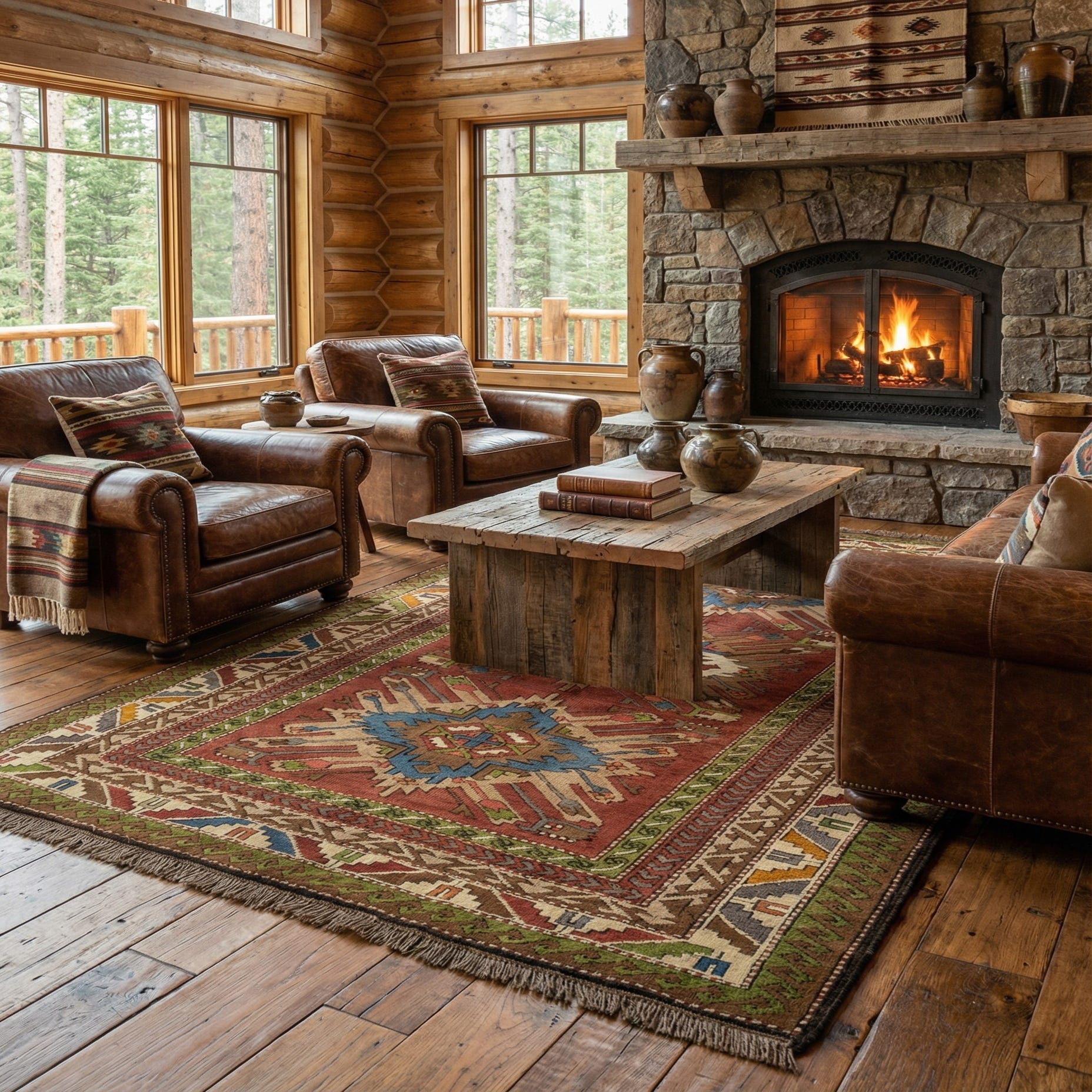 A 5x7 rectangular Kars rug featuring a central medallion and tribal patterns in rich reds, blues, greens, and browns.