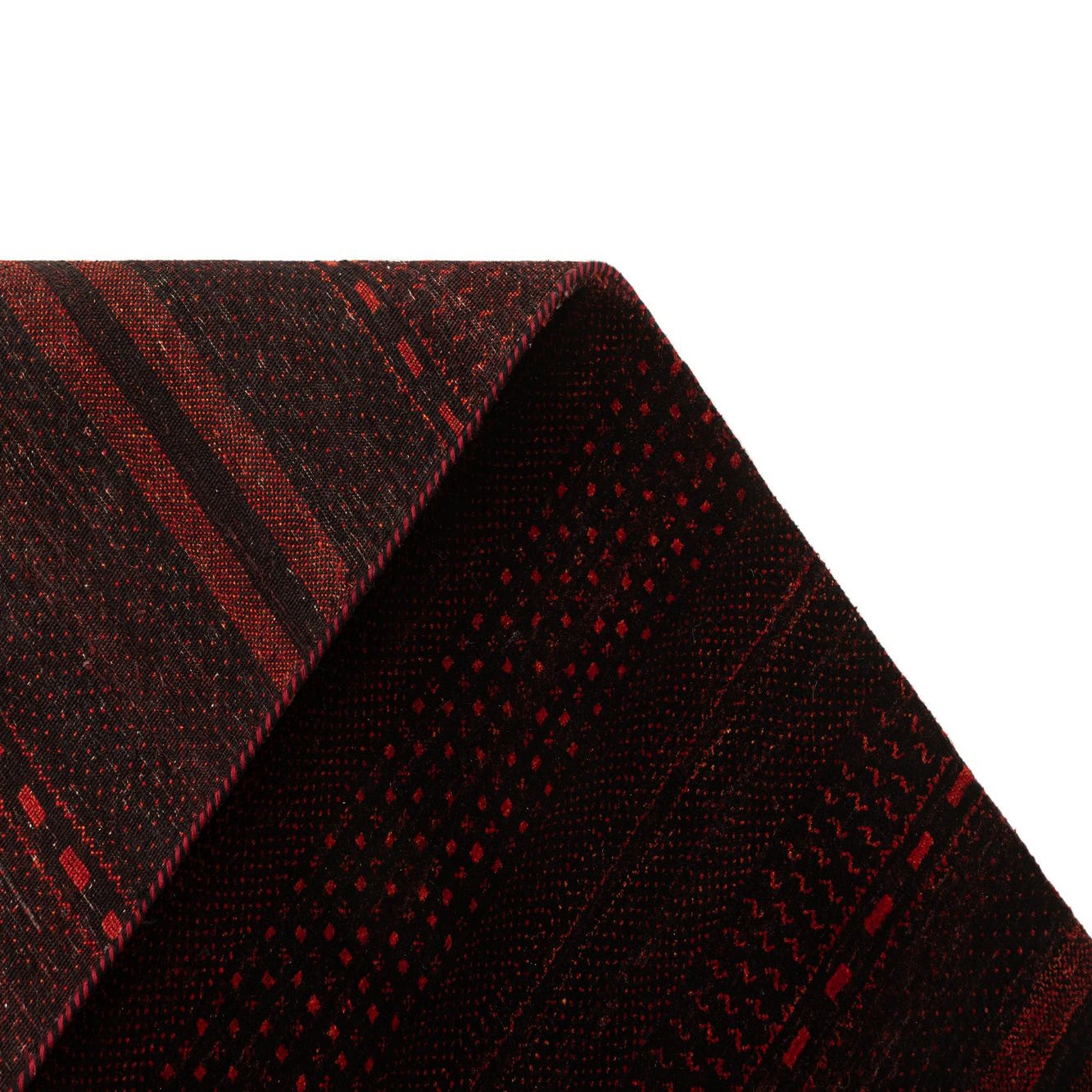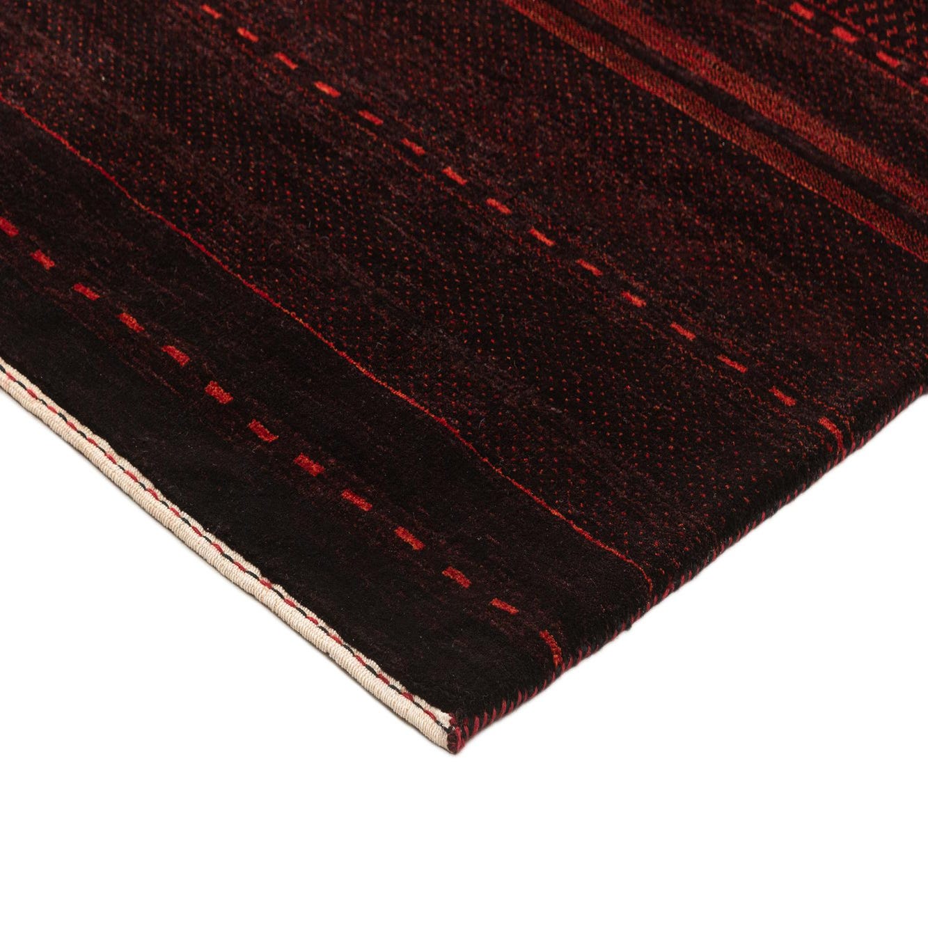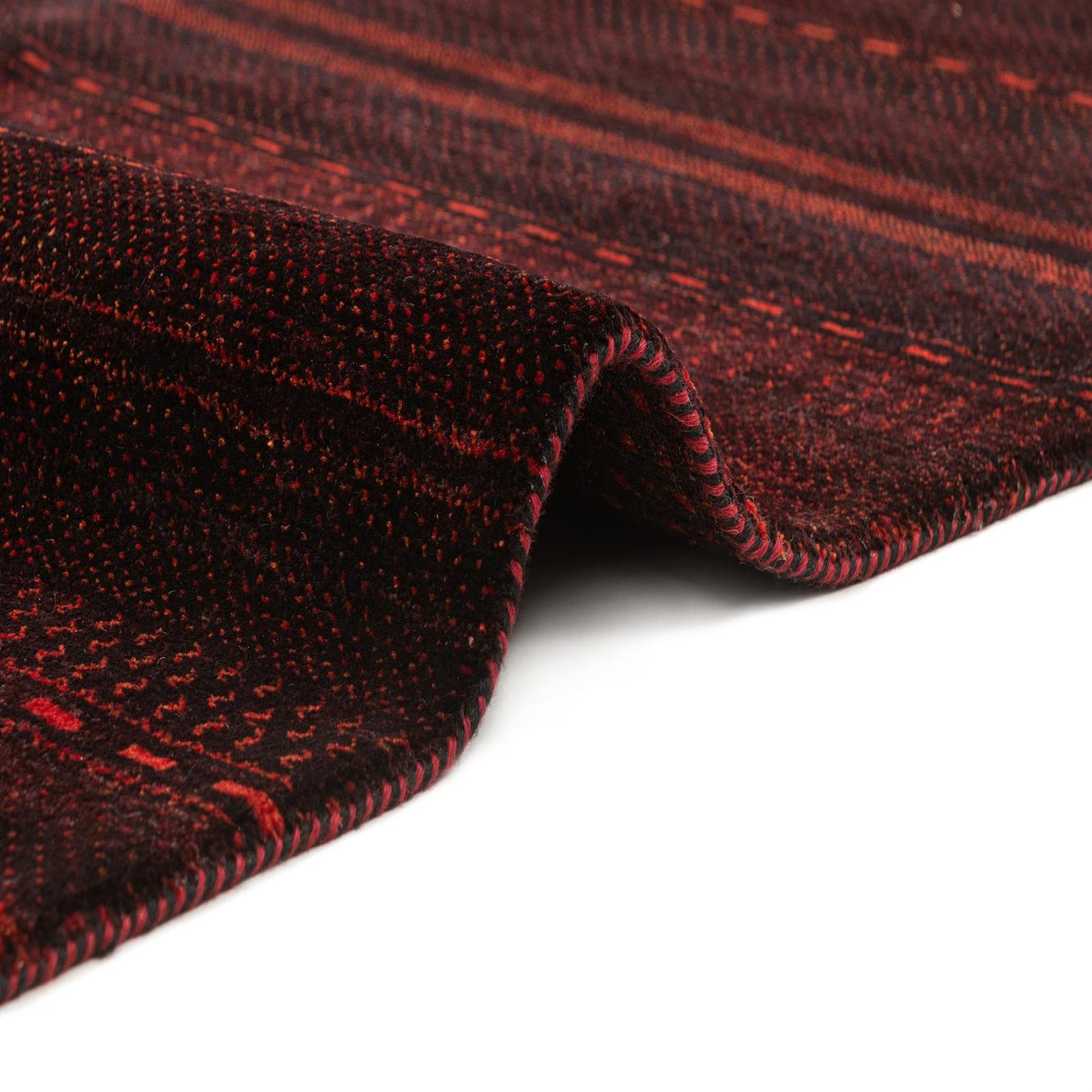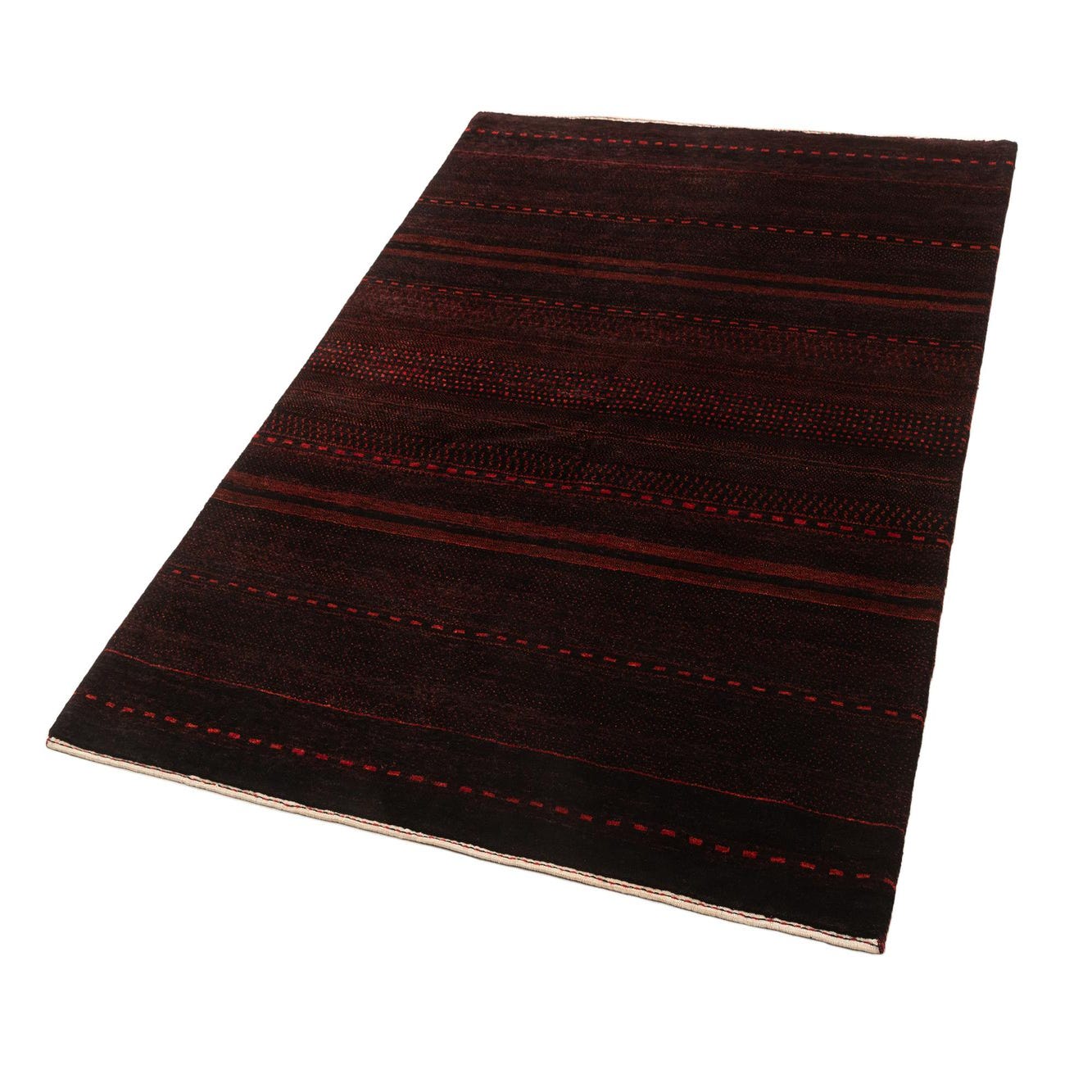 A 5x7 rectangular Kashkuli Gabbeh rug featuring horizontal stripes in varying shades of red and black, with intricate textured patterns.