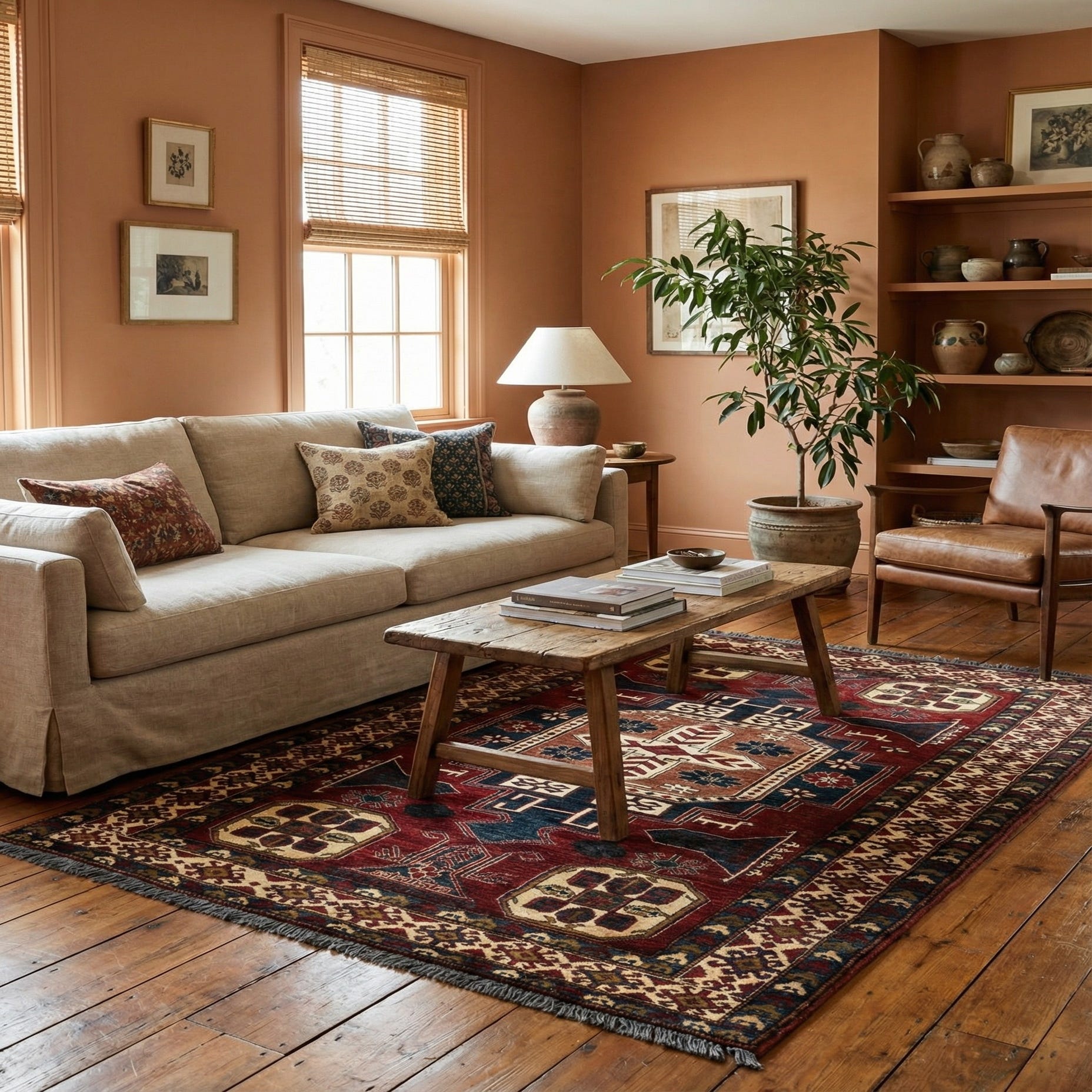 A 5x7 rectangular Kazak rug with a rich red field, featuring a large central medallion and geometric patterns in navy, cream, and brown, with fringed ends.