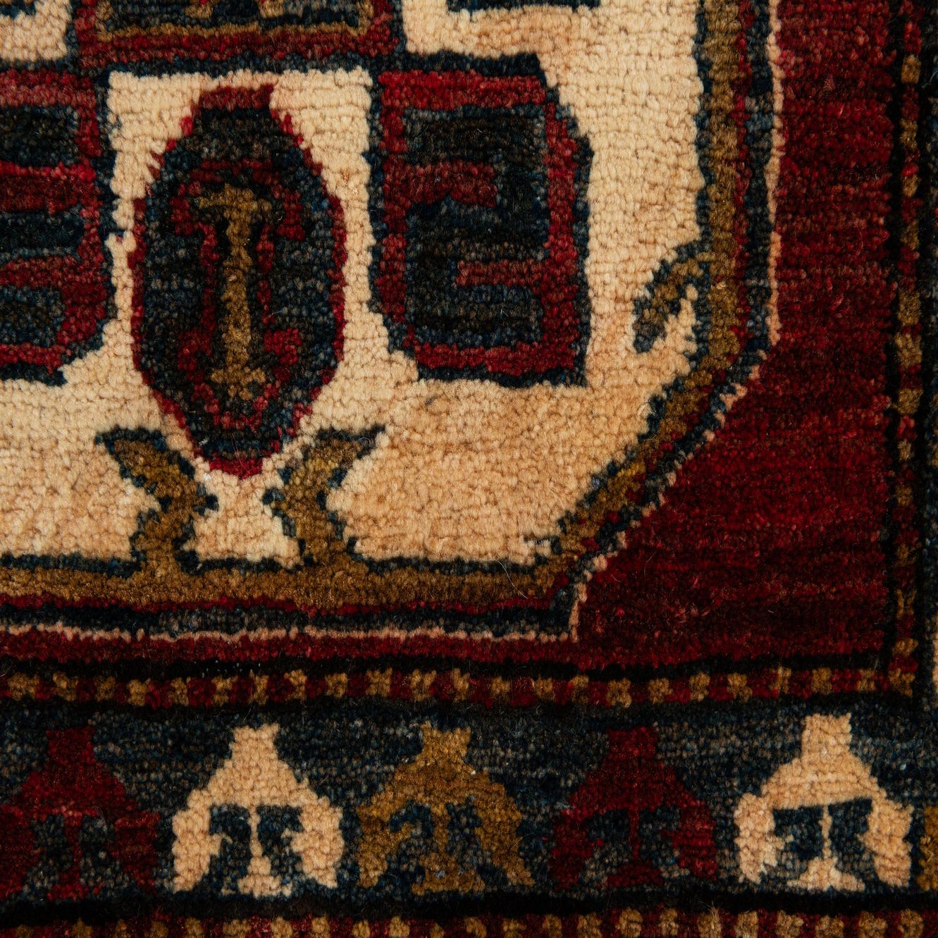 Primary color is Burgundy. Colors in this rug include: Burgundy, Blue, Ivory, Navy Blue, Light Brown.