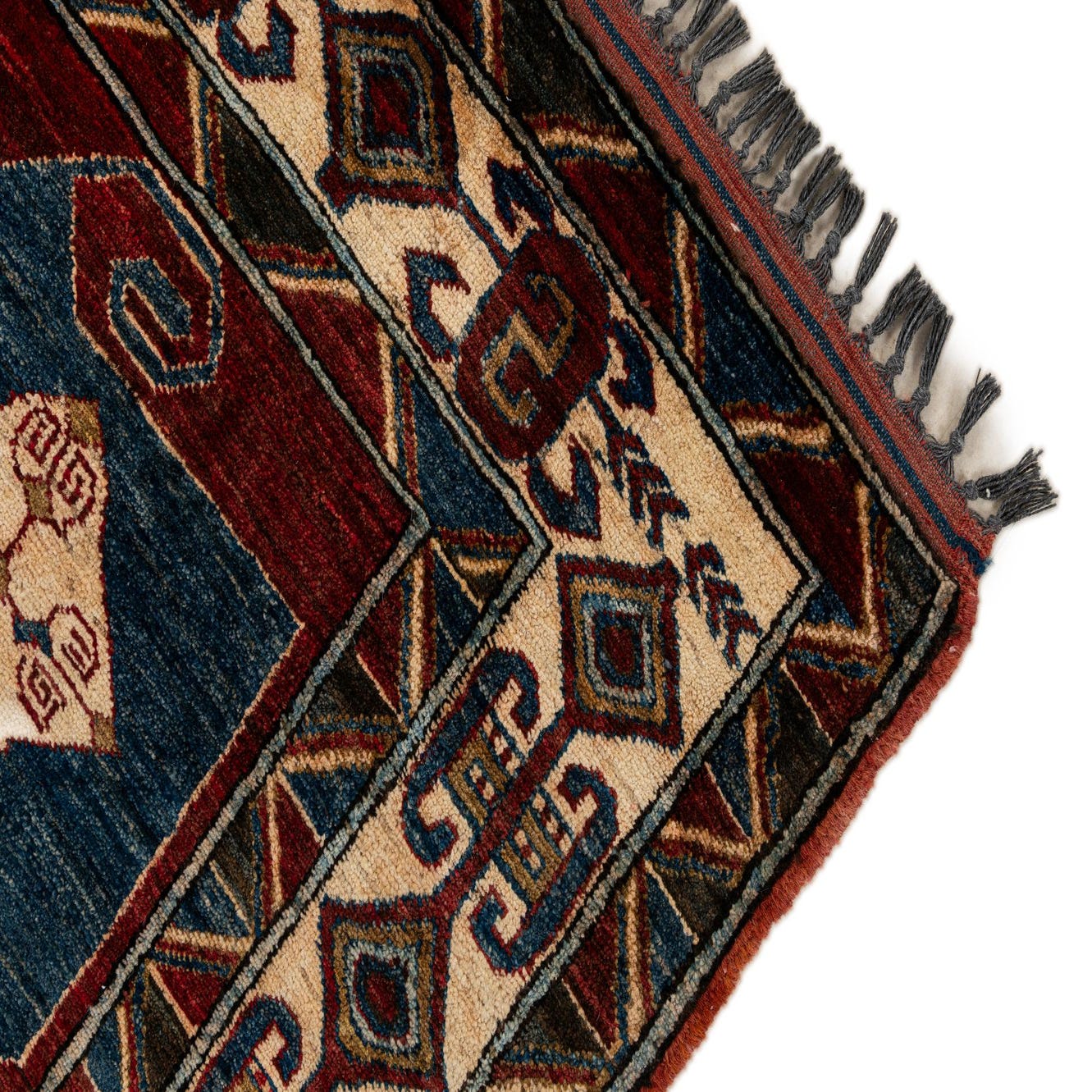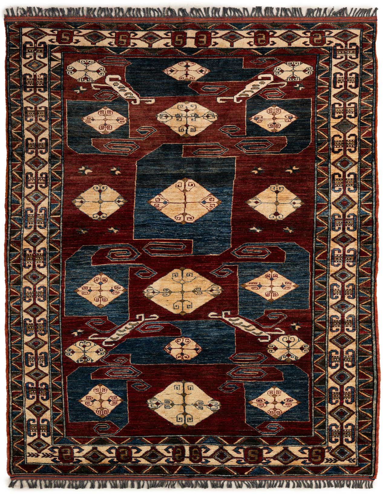 A 5x7 rectangular Kazak rug with a modern Oriental pattern in deep reds, blues, and cream, featuring geometric motifs.