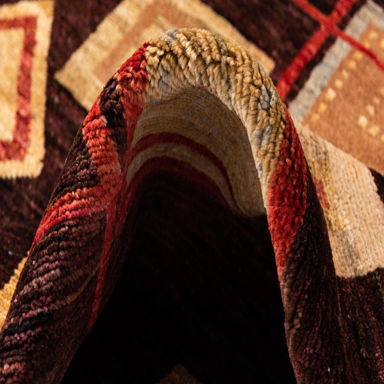 Primary color is Burgundy. Colors in this rug include: Burgundy, Beige, Brown, Red, Light Blue.