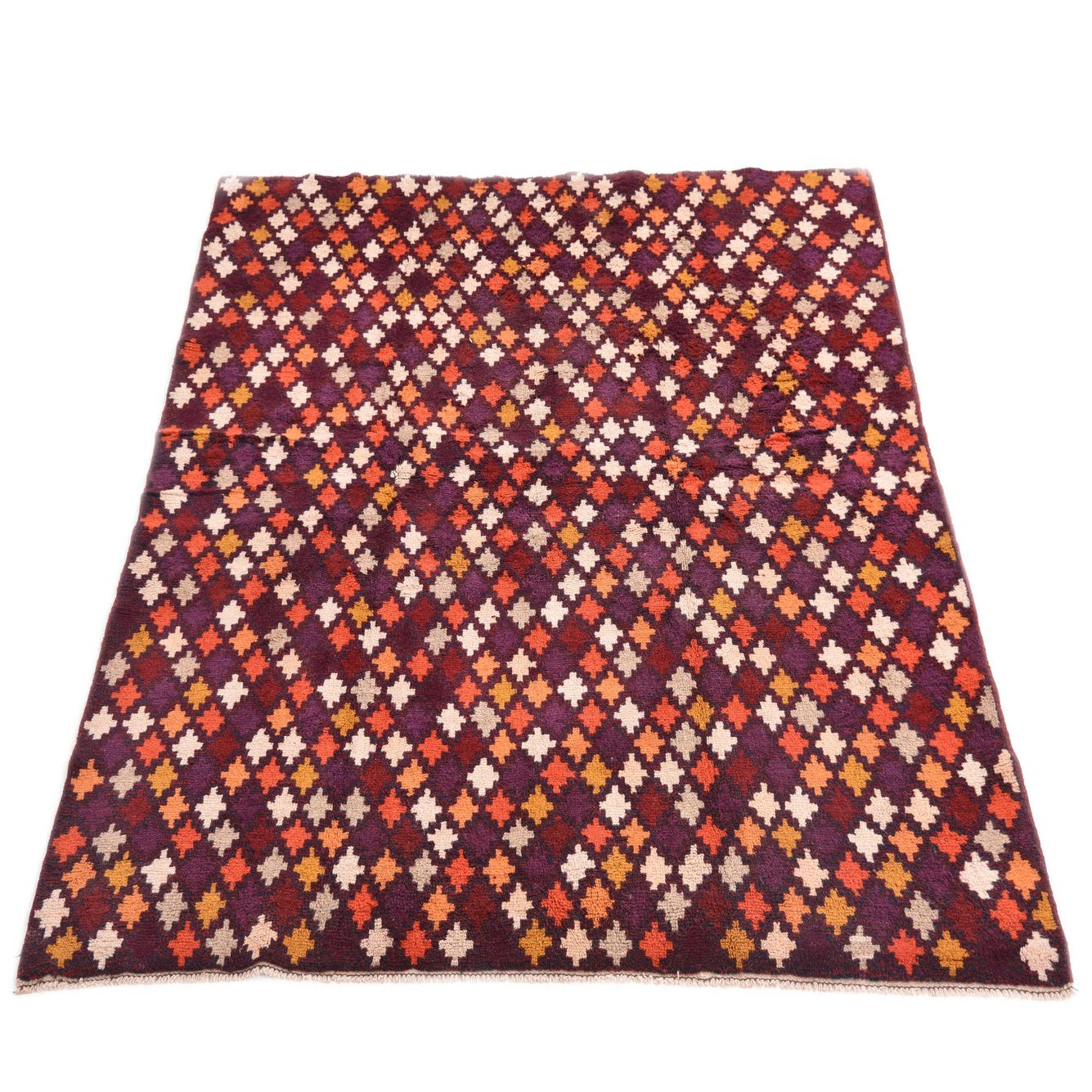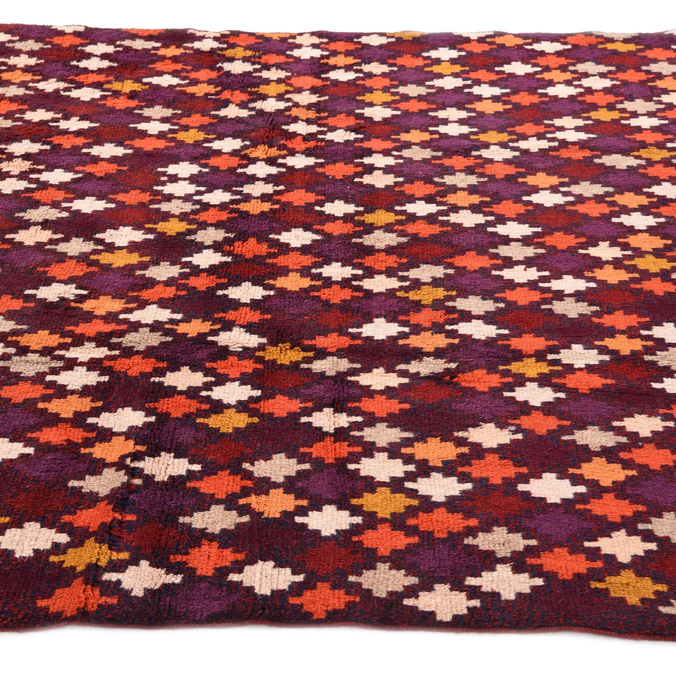 A 5x8 rectangular Balouch rug with a tribal, modern, abstract pattern in shades of red, orange, purple, and cream on a dark background.