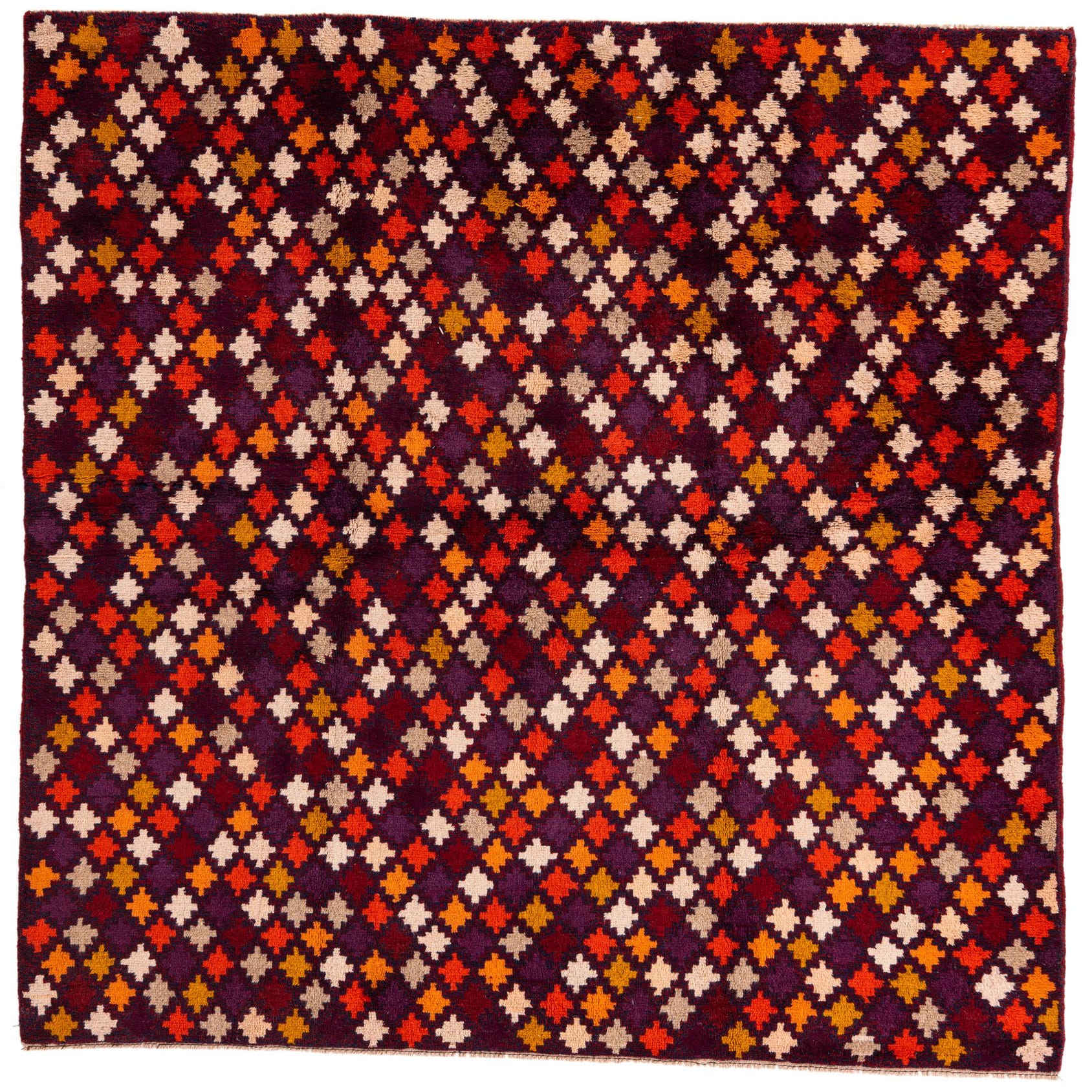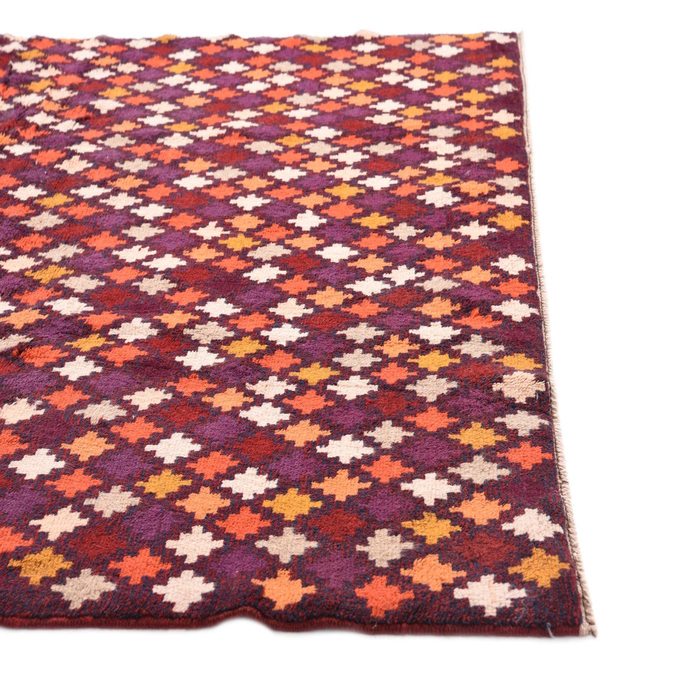 The Balouch collection presents a hand-knotted 5x8 rug crafted from 100% wool, offering a dense and enduring texture. The rug features a dynamic geometric pattern set against a rich burgundy background, with an array of colors including beige, orange, peach, purple, tan, terracotta, and pink adding vibrancy to the overall design. Traditional in its aesthetic, the rug is adorned with a classic fringe detail that lends an additional textural element.