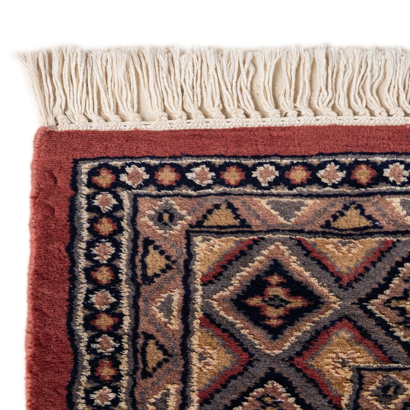 A 5x8 rectangular red Bokhara tribal rug with a traditional Oriental diamond pattern in gold, blue, and black, featuring white fringe.