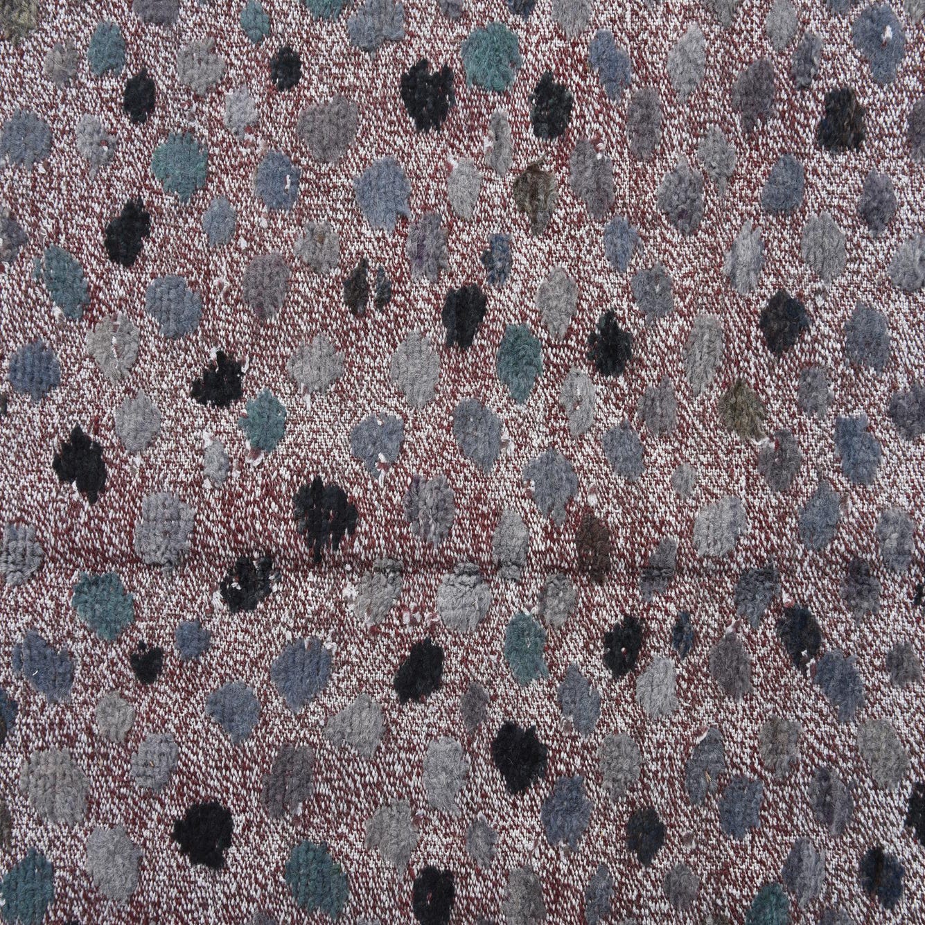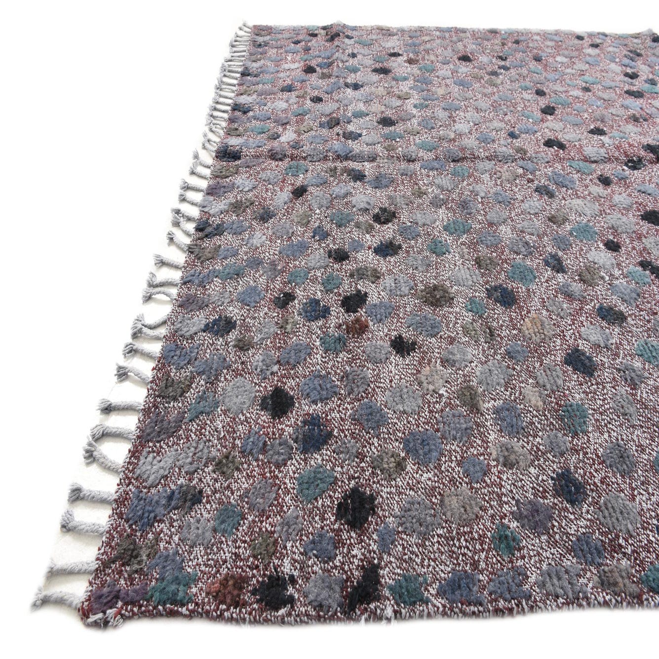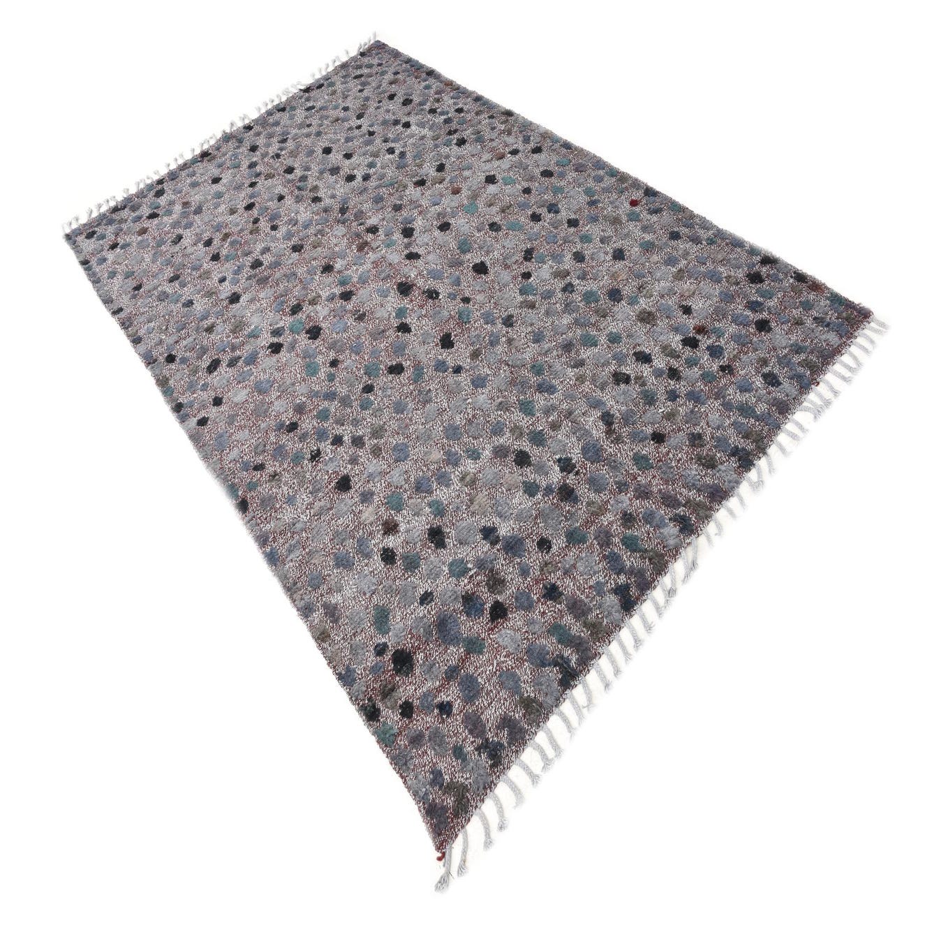 A 5x8 rectangular Darya rug with a modern abstract pattern in various shades of red, gray, and black, featuring a textured wool pile and fringed edges.
