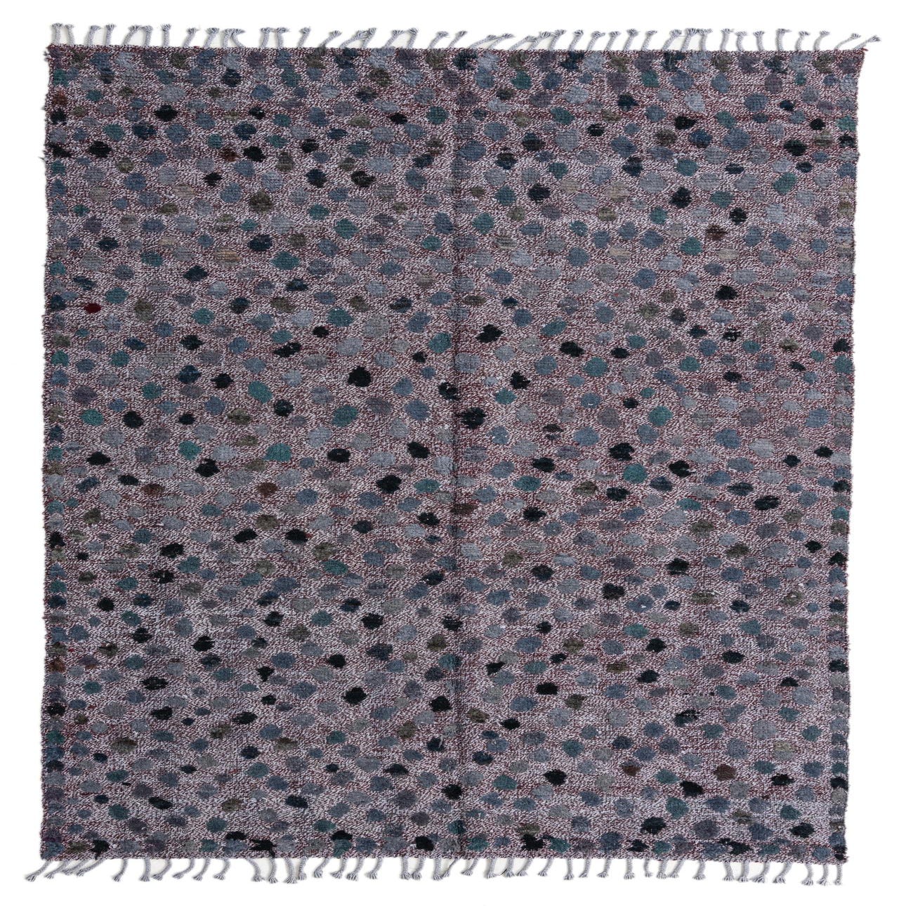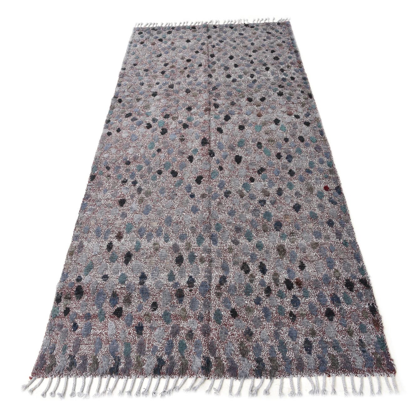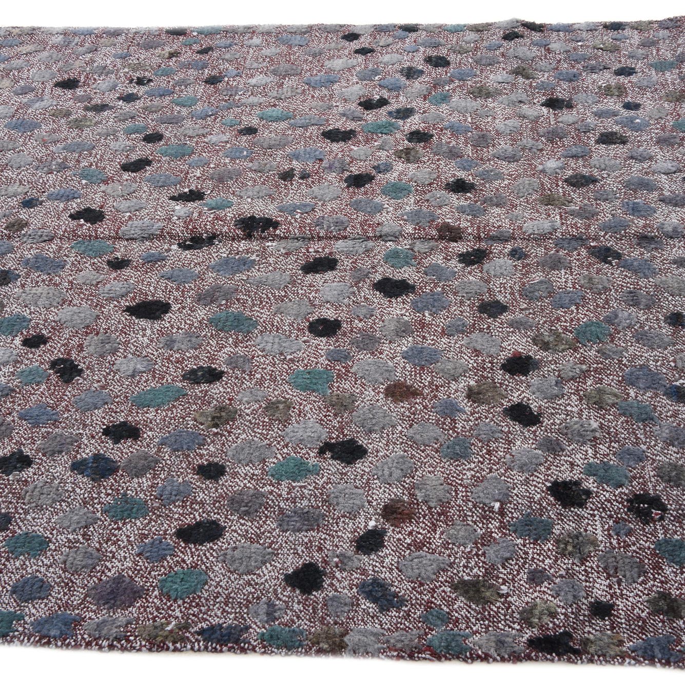 A 5x8 rectangular Darya rug with a modern abstract pattern in various shades of red, gray, and black, featuring a textured wool pile and fringed edges.