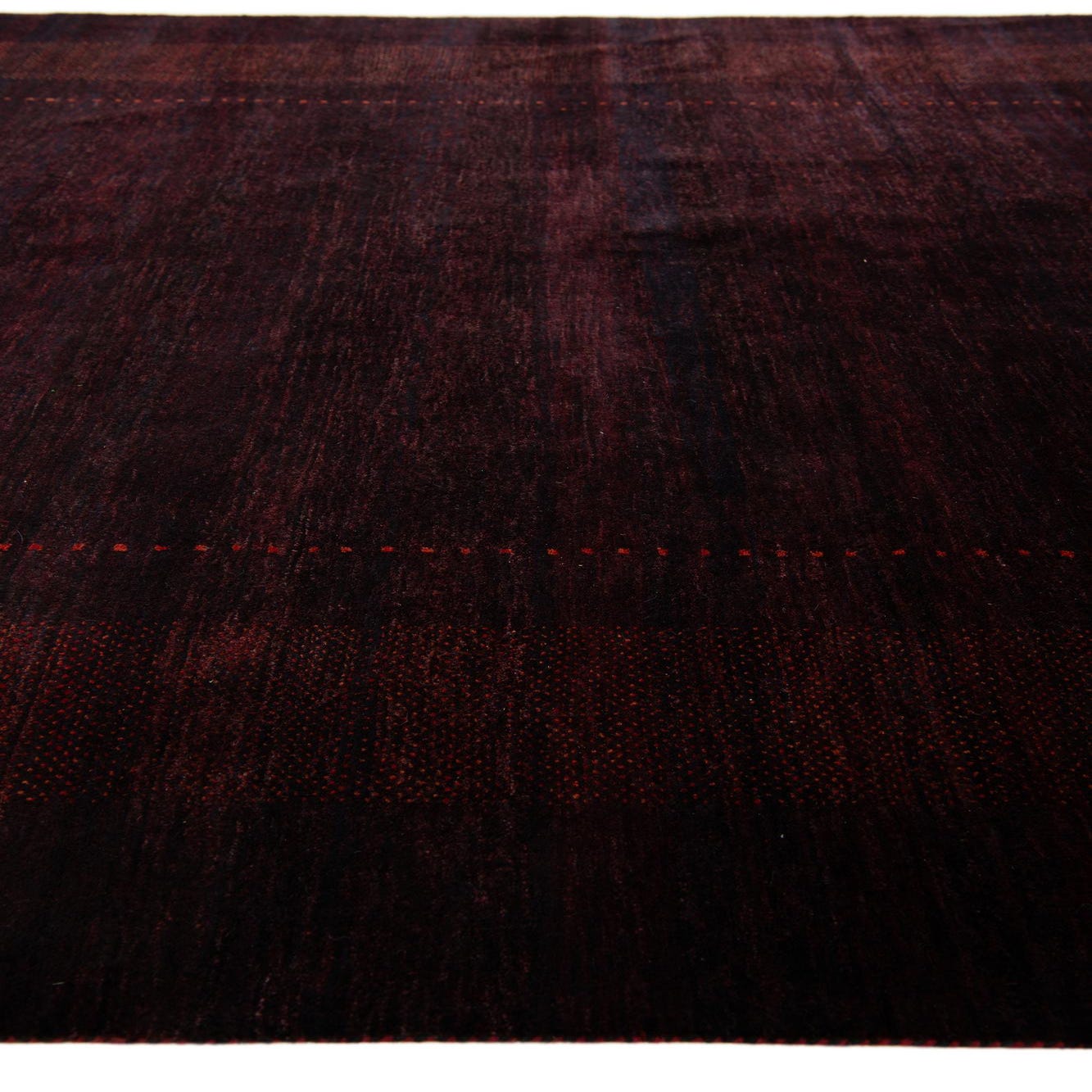 A 5x8 rectangular Gabbeh rug in deep red and black, featuring a subtle abstract border, ideal for a living room.