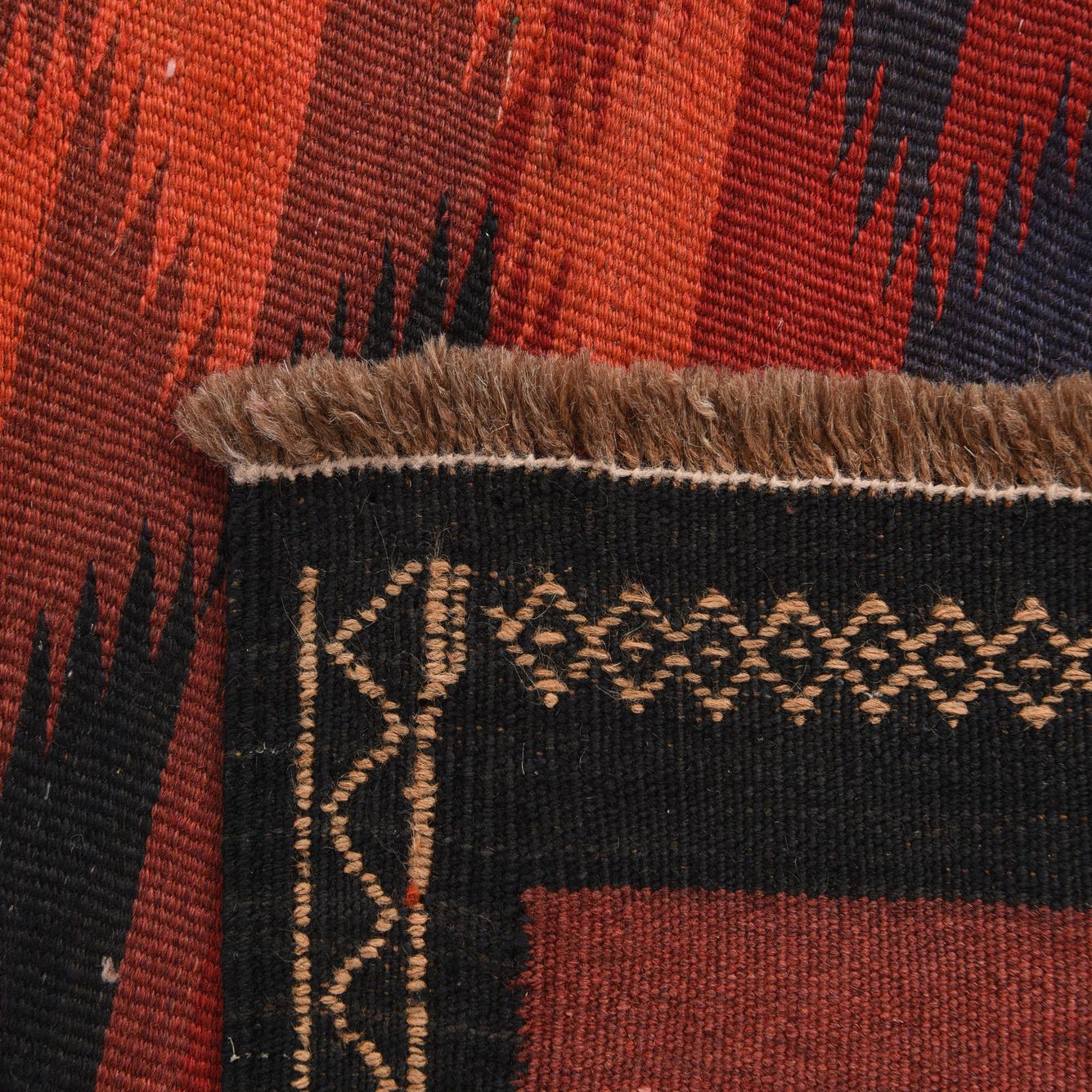 The Kilim Afghan rug is a hand-woven piece that boasts a robust Burgundy background, complemented by an array of colors including Navy Blue, Orange, Black, and Beige. This 5x8 rug features a traditional geometric pattern that brings a sense of texture and movement to its surface. Constructed from 100% wool, the rug offers both durability and a tactile experience underfoot.